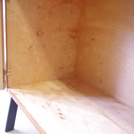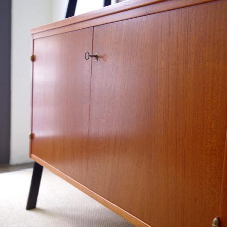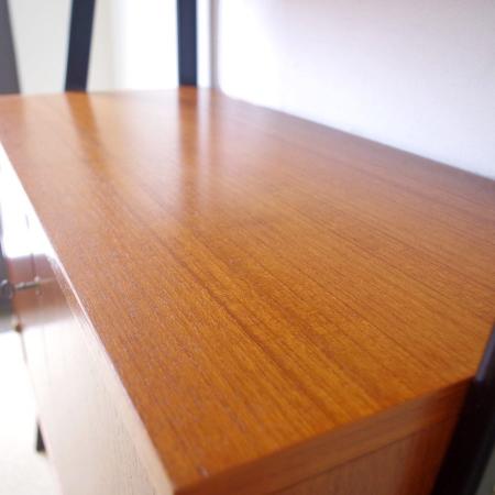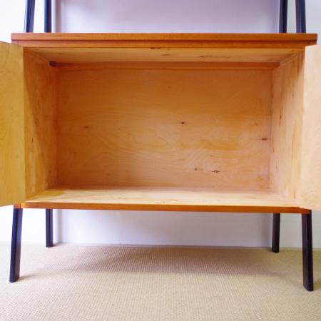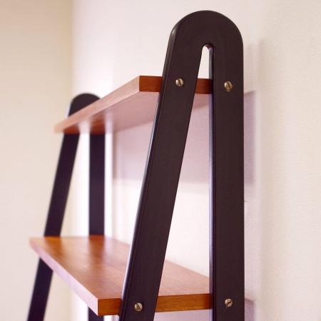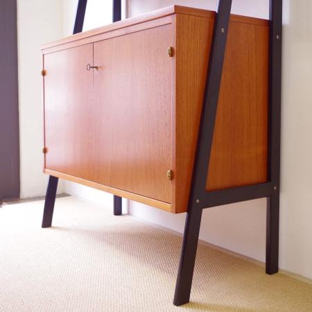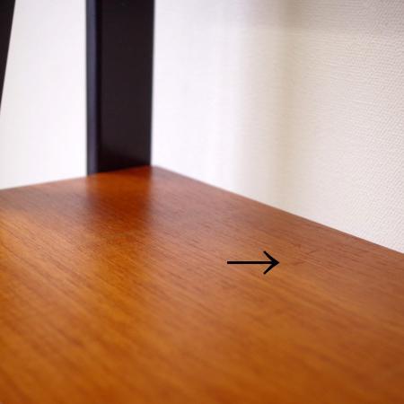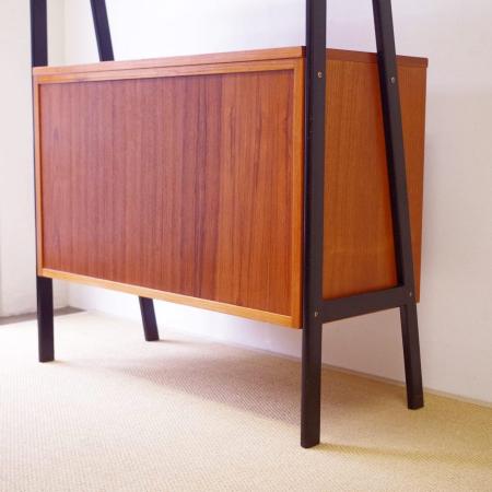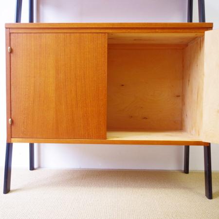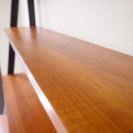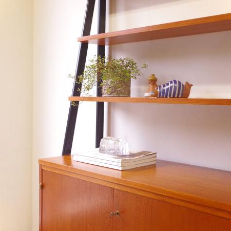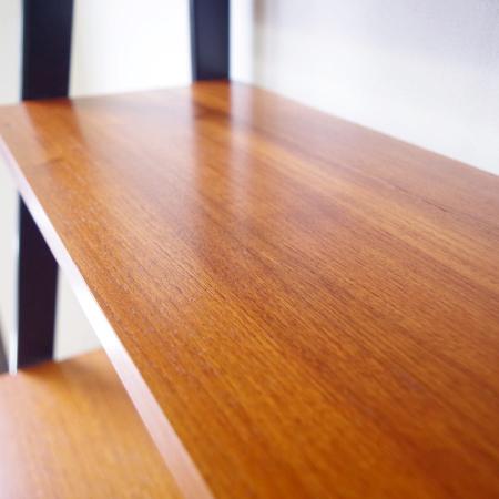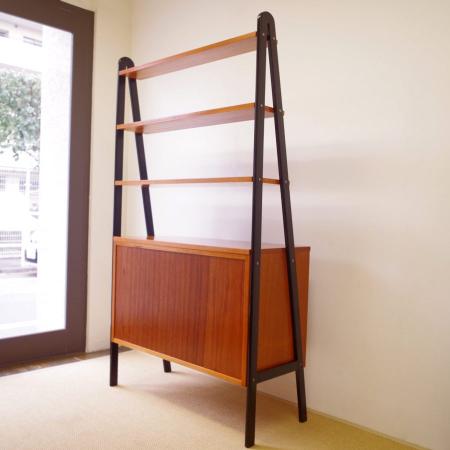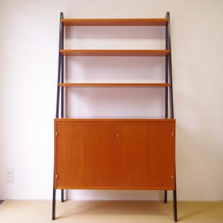1960年代スウェーデン製のヴィンテージ オープンシェルフです。 引出しや棚板をV字の2本の支柱で支えるとても抜け感のある造りで、チーク材にブラックフレームがモダンな印象を与えてくれます。背板がないためにぐっと圧迫感がなくなり、壁面を生かしたインテリアコーディネートもお楽しみいただけます。そして背面も化粧がしてあり裏面を見せることができるため、お部屋の間仕切りとしてもお使いいただけます。 程よい間隔の3枚の棚板には書籍を収納したり小物をディスプレイしたり、高さのあるものは下側のキャビネットに収納したりと、様々な用途が考えられます。 丁寧な修復を行いました。棚板などに落としきれない小キズがいくつかございますが、雰囲気を損ねるものではございません。キャビネット内部にはわずかな色ムラが見られますが、気にならない程度かと思います(色の濃い部分はヨゴレではなく杢目です)。詳しくは画像にてご確認ください。キャビネット内部の穴あけ加工や棚板作成なども別途承ることが可能ですので、事前にご相談ください。