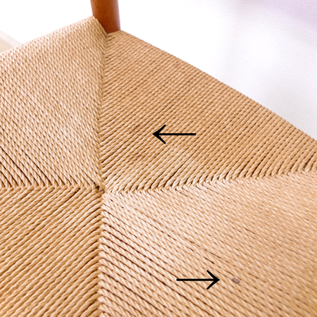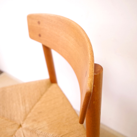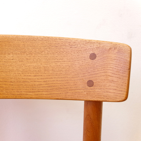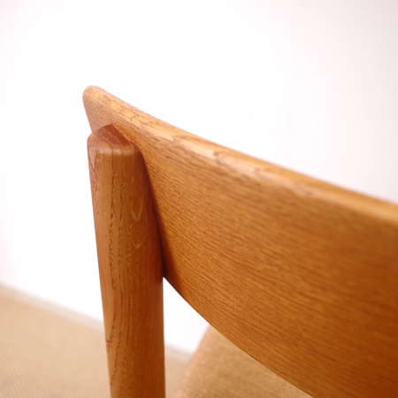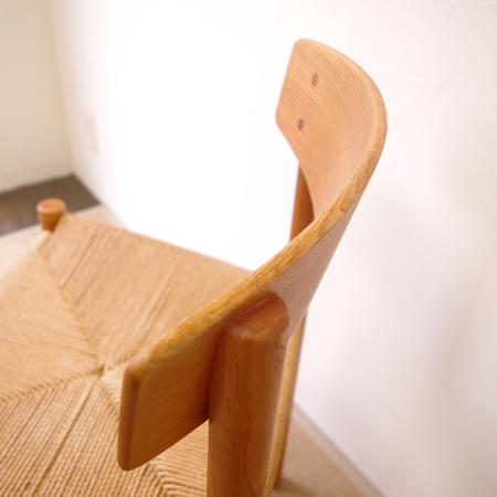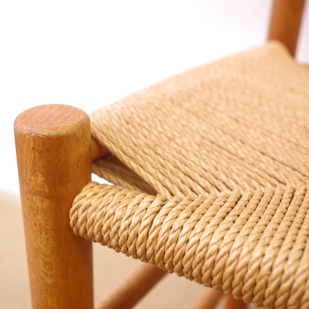 Borge Mogensenが1947年にデザインしました、デンマークFDB Mobler社製のシェーカーチェアJ39です。 シェーカースタイルをリデザインした、円柱の脚を組み合わせたシンプルな形状。これは『シンプルかつ実用的で美しい家具を、リーズナブルな価格で市民に提供する』というFDB Moblerの理念に基づき、自身が責任者をしていた時にデザインされたものです。 同じく座面にペーパーコードを用いたウェグナー作のYチェアと比べると、わずかに太さのあるものを使用しているためか、座面を含めて全体的におおらかな印象を受けます。キャビネットメーカーを変えながらも現在でもなお製造されている時代を超えて愛されるJ39を、年月を経て美しい飴色に変わったオーク材のフレームでお楽しみください。 丁寧な修復を行い、綺麗な状態です。ペーパーコード部分に落としきれないシミがございますので、画像にてご確認ください。