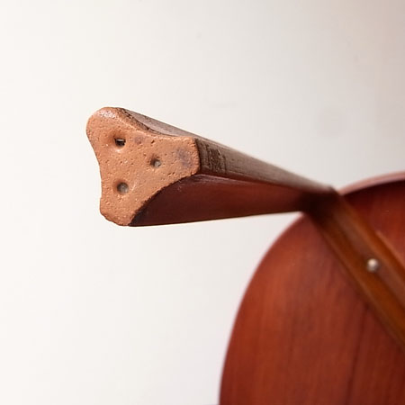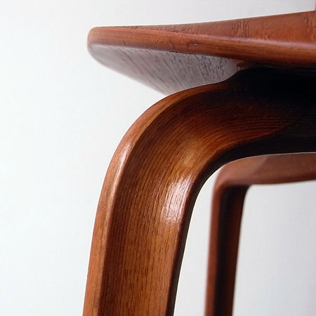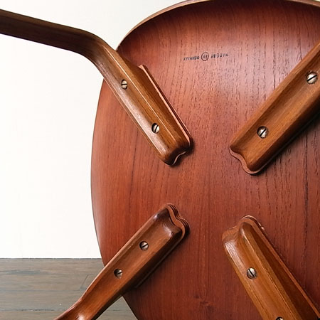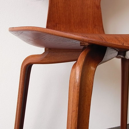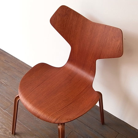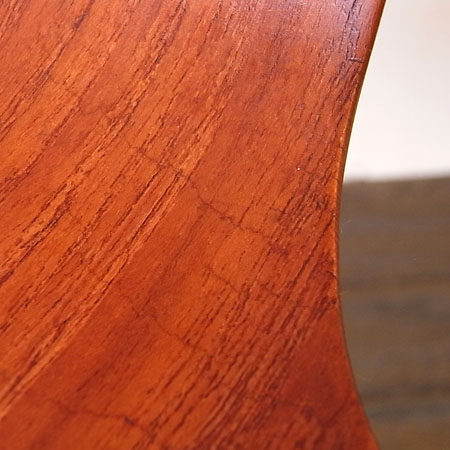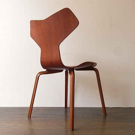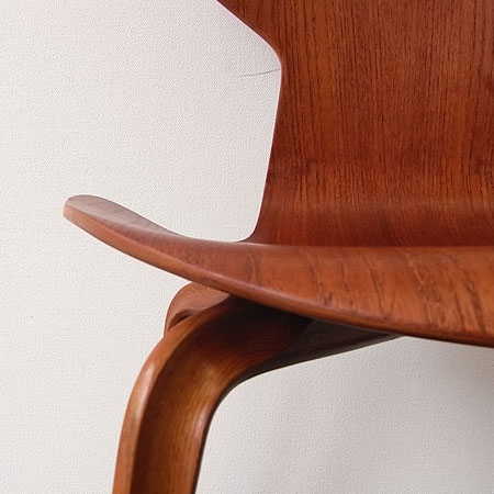 アルネ・ヤコブセンによるデザインの初期グランプリチェアです。1957年にデザインされたこの椅子は、ミラノ・トリエンナーレにてグランプリを獲得したことから「グランプリチェア」と呼ばれるようになりました。 2008年より復刻されているものは他のヤコブセンのチェアと同じくスチール脚ですが、このヴィンテージ品はフルウッドなります。脚部は積層材で変形六角形に仕上げられている、とても手の込んだデザインです。脚部の接合部分からみて、オリジナルの中でも一番初期のモデルという現地でもまず見かけない貴重な一脚です。 腰部にクラックがみられますので、背もたれに全体重をかけてお座りいただく事は避けた方がよいかもしれません。詳しくは画像にてご確認ください。