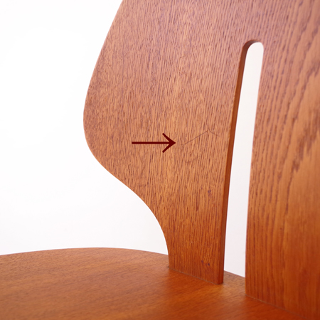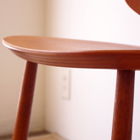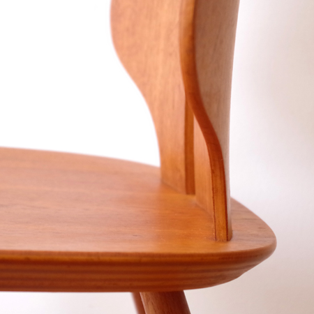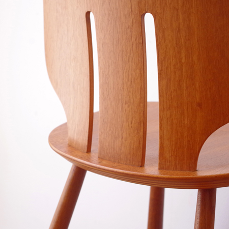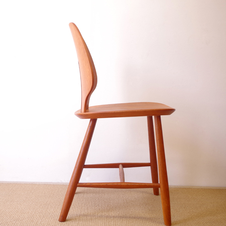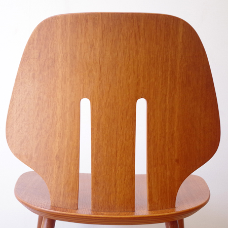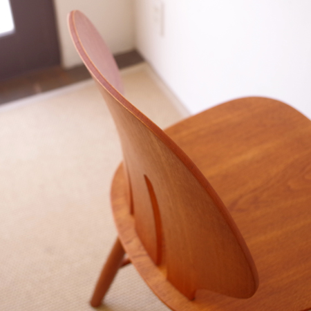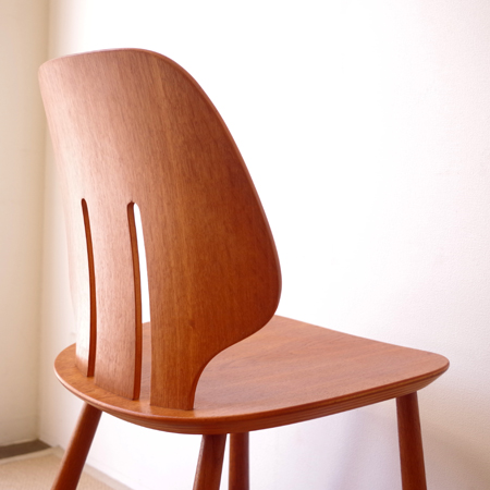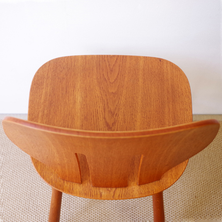 Ejvind A. Johanssonが1957年にデザインしました、デンマークFDB Mobler社製のダイニングチェアJ67です。 座面に向かうくびれや中央に入った2本の切り込みなど幅広な背板のデザインが、全体の印象を特徴づけています。その切り込みは単にデザインとしてでなく、身体をしっかりと包み込む三次曲線を作り出すもので、プライウッドの特性を見事に活かしています。面の部分が多くしっかりとした造りですが、そうした背板や脚部などの曲線によって柔らかな雰囲気に感じます。 FDB Mobler社は『シンプルかつ実用的で美しい家具を、リーズナブルな価格で市民に提供する』という理念の元に戦後デンマークにて作られた生協のような組合で、ヨハンソンはBorge Mogensen、Poul M. Voltherの後を継いでチーフを務めました。 丁寧な修復を行い、気にならない程度の小キズなどありますが、全体として綺麗な状態です。詳しくは画像にてご確認ください。