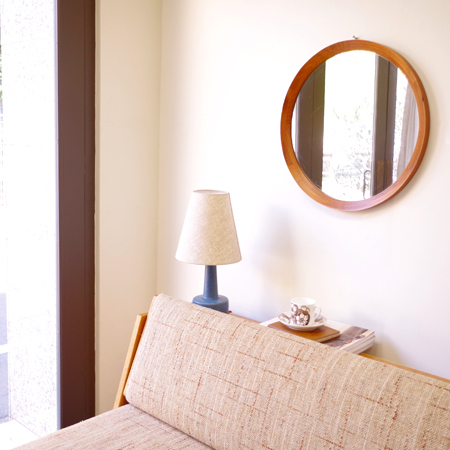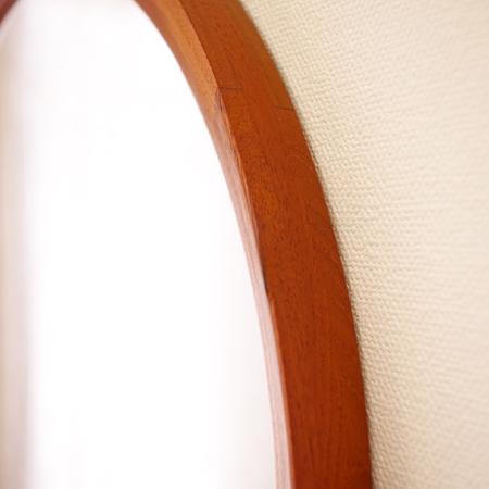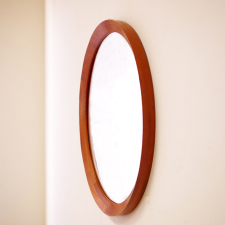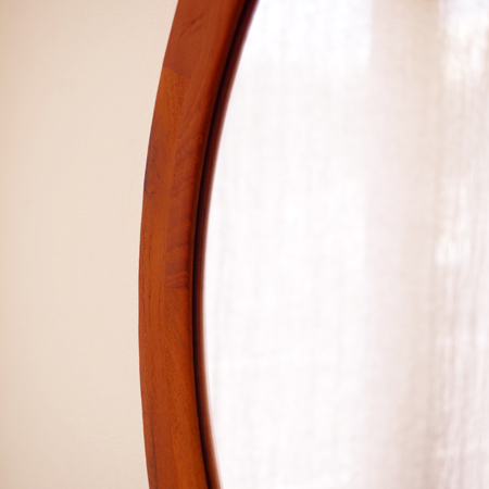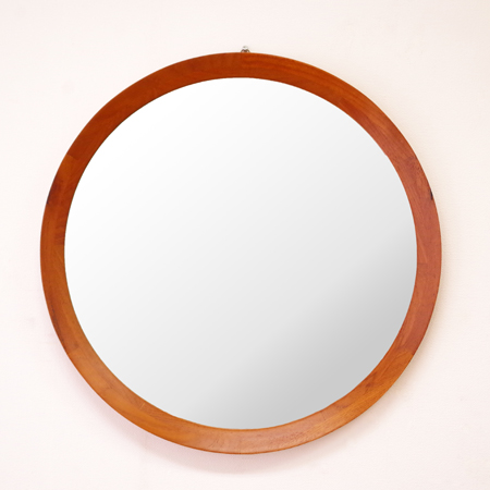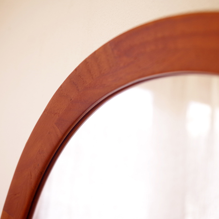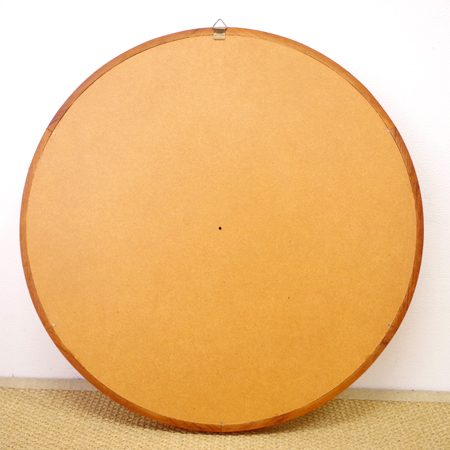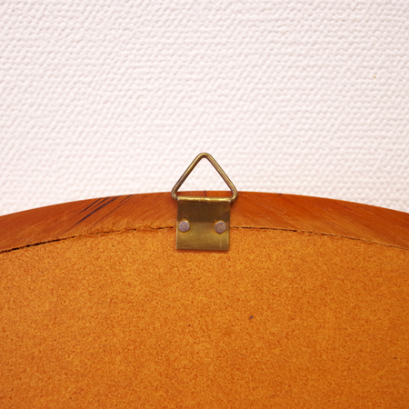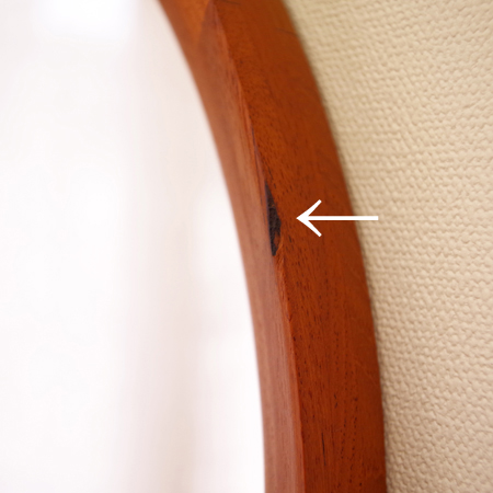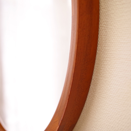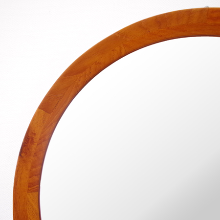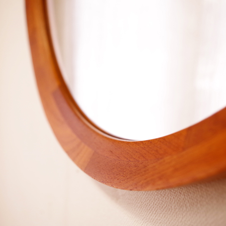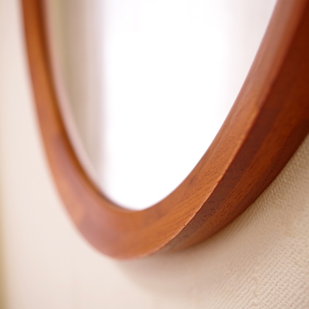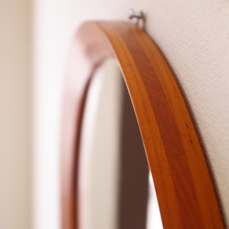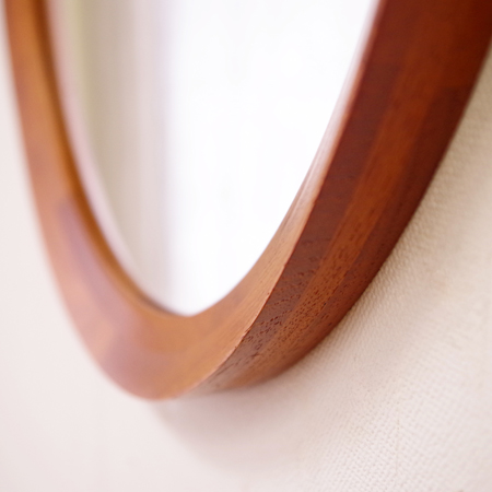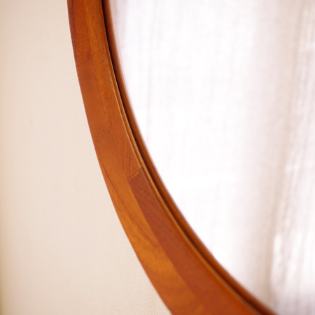 1960年代デンマーク製の、ヴィンテージ壁掛ミラーです。 長方形など直線的な形の多いミラーの中では珍しい円形ミラーを、チーク無垢材の寄木にて縁取りしたデザインです。横から見るとすり鉢のように緩やかな角度でテーパーが掛けられており、何気なく見えるようで工芸的な造りの一台です。 玄関やサニタリールームなどにお掛けいただき、毎日の身だしなみを整えるのに活躍してくれそうです。存在感があるため、絵を飾るように壁面のアクセントとしてもお楽しみいただけます。 丁寧な修復を行いまして、全体的に綺麗な状態です。白矢印の箇所は、木部の節にあたるところで、キズではございません。詳しくは画像にてご確認ください。