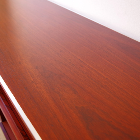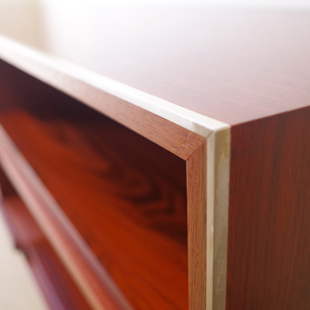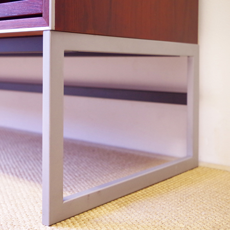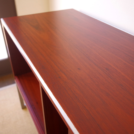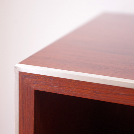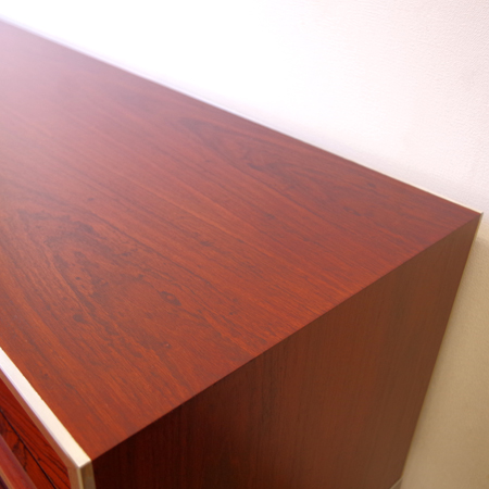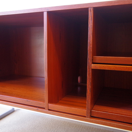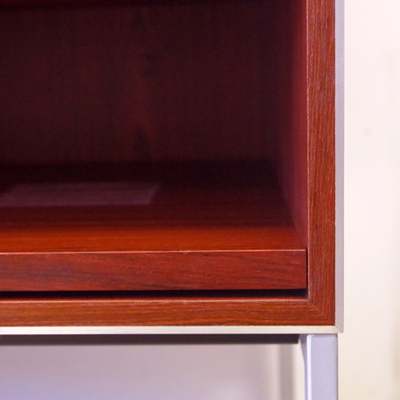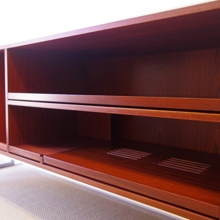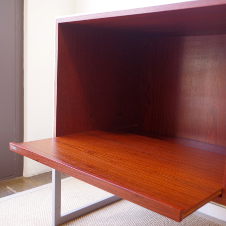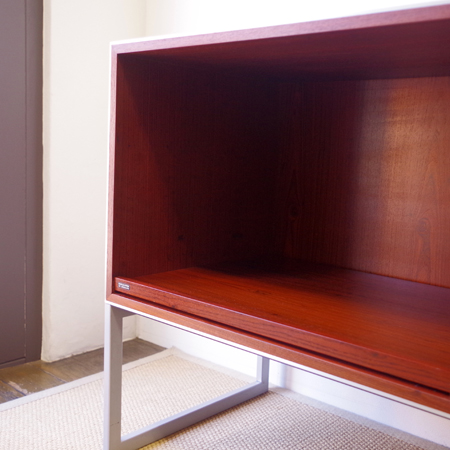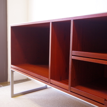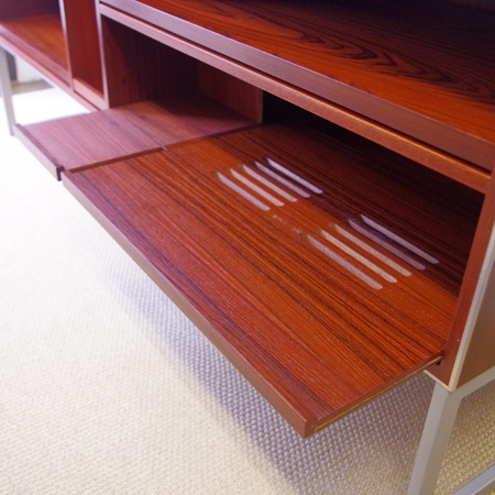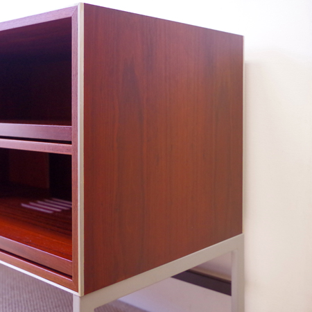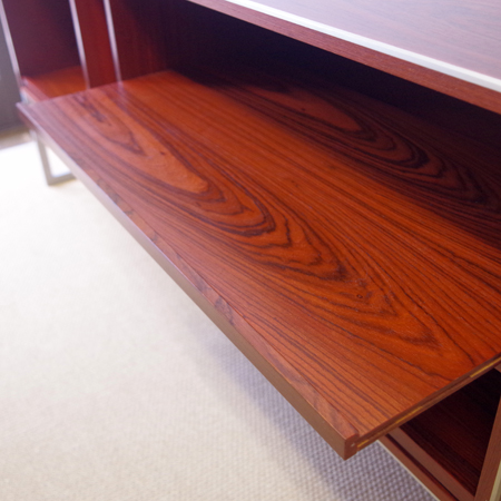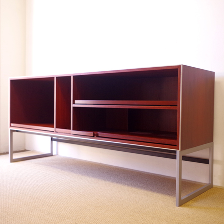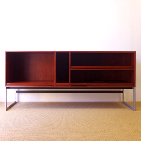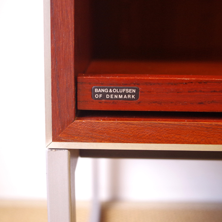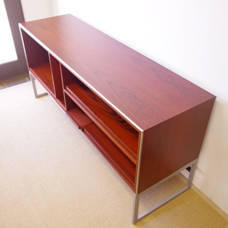 1960年代に製造された、デンマークの高級オーディオメーカーBang&Olufsen社製のヴィンテージキャビネットです。 ローズウッド材のキャビネットに金属製の脚を合わせたデザインは、1960年代にはとても斬新だったはずです。また脚だけでなく側面に沿ってスチールがはめ込んであるため、脚からの連続性を感じさせてくれます。 棚はオーディオ機器を1ヶ所にすっきりと収納することのできる、計算された設計となっております。5つに分かれた部屋のうち、4ヶ所はスライド式で引き出せるようになっております。また5つ全ての部屋の側面にコードを逃がすための穴が開けられており、二重構造となった下段中央にまとめて、下穴から外へと逃がすことができるようになっております。雑然としてしまうコードを、いかにスマートにまとめるか、ここまで考えられたラックは他にはないのではないでしょうか。脚部がしっかりとしておりますので、現在の薄型大画面のテレビを置いても良いでしょう 丁寧な修復を行いまして、非常に綺麗な状態です。フレーム・脚部のスチール部分に若干の経年感はございますが、まず気にならない程度です。詳しくは画像にてご確認ください。
