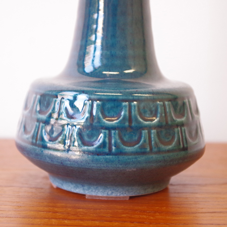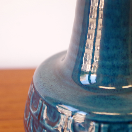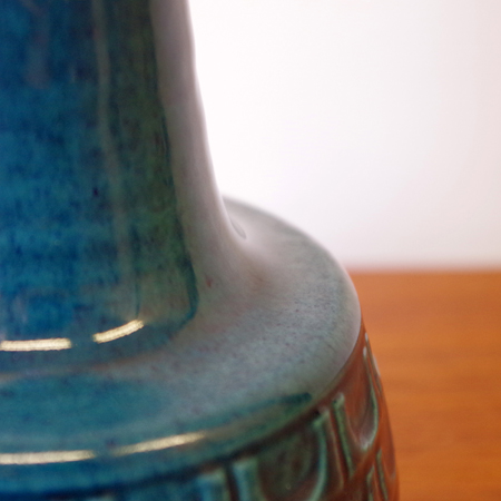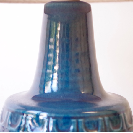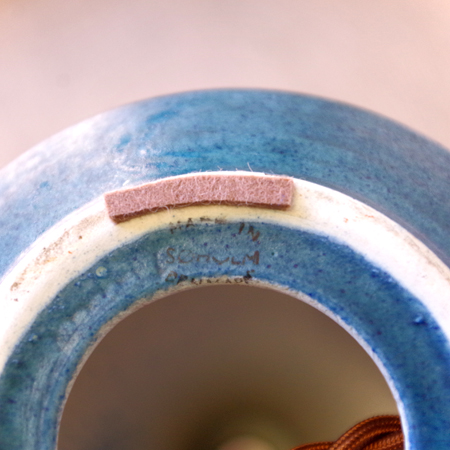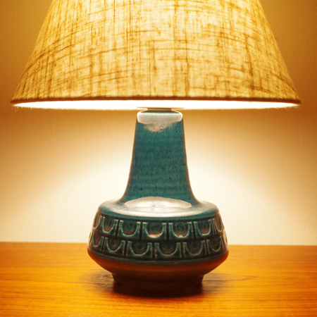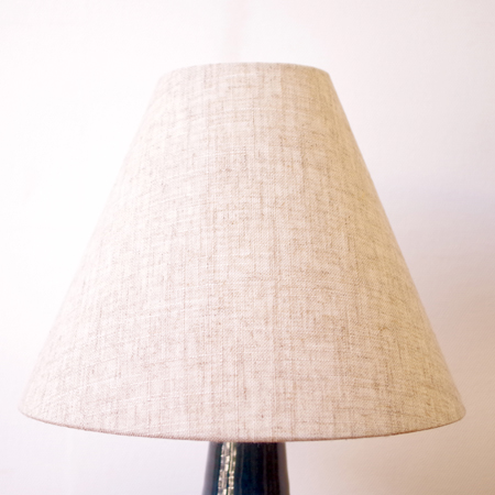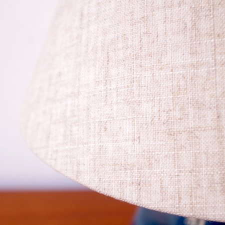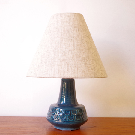 1835年にデンマークのボーンホルム島に窯を開いた、Soholm窯の陶製ベースを用いたヴィンテージ テーブルランプです。 本体に刻まれた幾何学模様は、釉薬のかかり具合によって色のグラデーションを作り出し、明かりを灯した際にまた違った表情を見せてくれます。 また艶のある藍色は単調ではない深みのある色合いで、きりりとした雰囲気はお部屋の程よいアクセントになるのではないでしょうか。 シェードは本体の形が美しく見えるように国内にてオーダーしたもので、明かりを灯すとリネン地の風合いがまた違った表情を作り出してくれます。新しく交換したコードなども、ヴィンテージの風合いに合うデザインをセレクトました。 電気工事士の資格を持つ職人によりソケット・コード・プラグ等の電気に関わる部分は全て交換しまして、電気用品安全法に基づいた点検なども行いPSEマークを表示しておりますので、新しいもの同様に安心してご使用いただけます(詳しくは下記をご覧ください)。