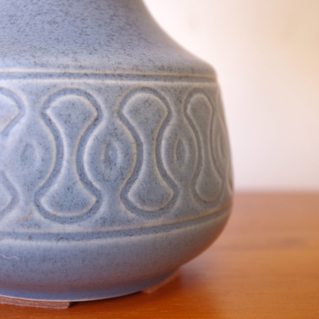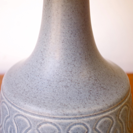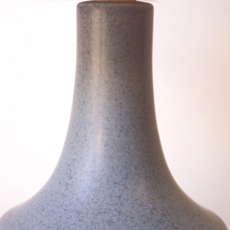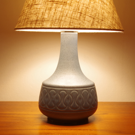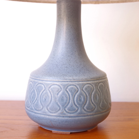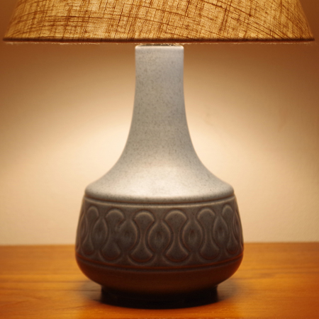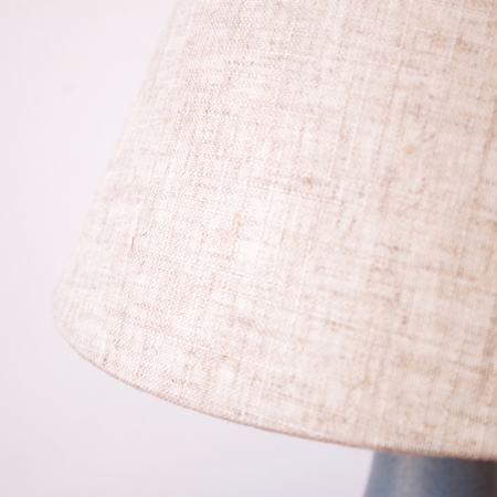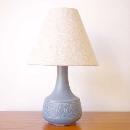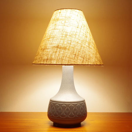 1835年にデンマークのボーンホルム島に窯を開いた、Soholm窯の陶製ベースを用いたヴィンテージ テーブルランプです。 本体に刻まれた幾何学模様は、釉薬のかかり具合によって色のグラデーションを作り出し、明かりを灯した際にまた違った表情を見せてくれます。 またやわらかなペールブルーの釉薬は、きりりとした青の釉薬を得意とするこの窯の作品の中ではとりわけ珍しい色合いです。ほっこりとした雰囲気は、お部屋の程よいアクセントになるのではないでしょうか。 シェードは本体の形が美しく見えるように国内にてオーダーしたもので、明かりを灯すとリネン地の風合いがまた違った表情を作り出してくれます。新しく交換したコードなども、ヴィンテージの風合いに合うデザインをセレクトました。 電気工事士の資格を持つ職人によりソケット・コード・プラグ等の電気に関わる部分は全て交換しまして、電気用品安全法に基づいた点検なども行いPSEマークを表示しておりますので、新しいもの同様に安心してご使用いただけます(詳しくは下記をご覧ください)。