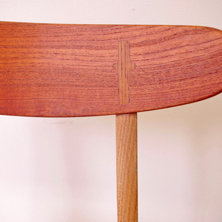 2つの椅子ともフレームがオーク材、笠木(背もたれ )はチーク材を使用しております。色味が異なるのは仕上方法(右側がソープ&オイル仕上・左側がオイル仕上)の違いによるもの。お使いの家具に合わせたり木材の色を生かしたりとお好みでしょうが、いずれもやさしい木の風合いが保たれています。ファブリックはこれくらいの小さな面積なので、少し冒険したかなと思うくらいの色でもお部屋のアクセントとなって素敵ですよ。