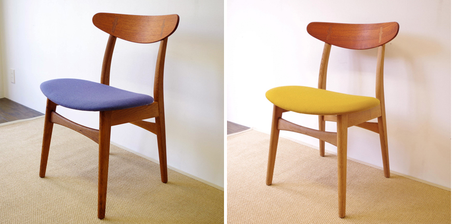 同じヴィンテージの椅子なのですが、木材の仕上方法と座面のファブリックによってこんなに雰囲気が変わります。