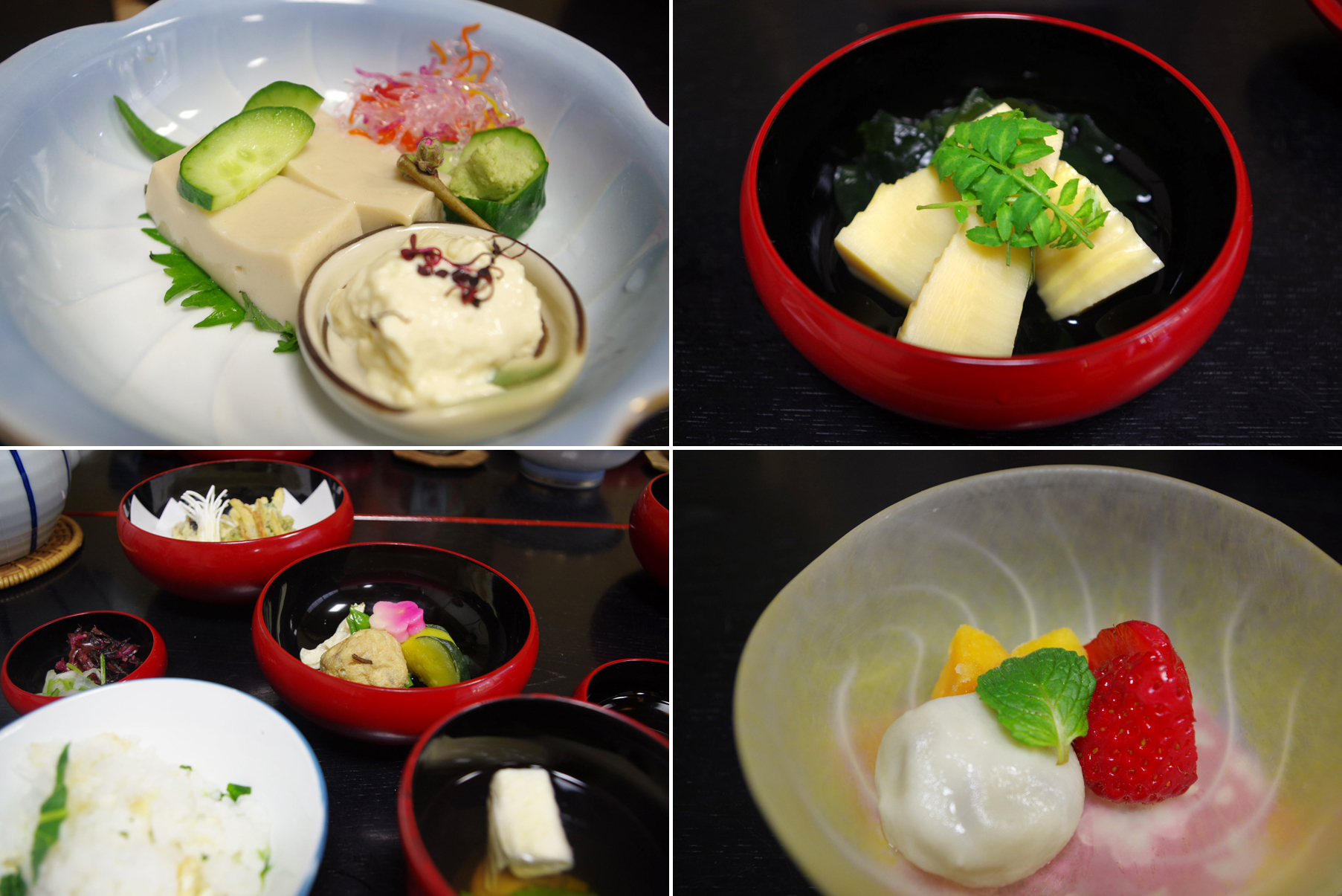 精進料理ということで湯葉に生麩、凍み豆腐、お揚げに白和えと、お豆腐料理のオンパレード。今は大好きですが元々お肉もお魚も苦手だった私の主菜はお豆腐、こんなに多種多様なお豆腐料理には目が輝いてしまいます。