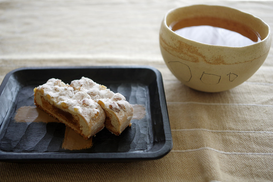 そしてその器に盛った本日のおやつは、”くるみそば”と”そば茶”のそばづくし。信濃路うさぎやのレトロな包み紙に引かれて、自分たちのお土産に。蕎麦粉を使った生地の中には白あん、上にクルミがたっぷりちりばめられた焼き菓子。フランスの地方菓子にありそうな、素朴で香ばしい好みのお味でした。