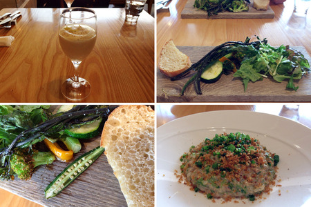 始めにやってきたグラス入りのヴィシソワーズ(ジャガイモの冷製スープ)は、ごくごく控えめにカレーのスパイスが効いていて美味しい!これは家でも真似してみようとじっくり味わって。。お次は木のトレイにて出てきた素敵な盛り付けの温野菜のサラダ、たらの芽や菜の花が入っていて春の息吹をいただきました。メインのリゾットは牡蠣と青海苔だったのですが、苦手と伝えると鯖に変更してくれました。ありがたい。。こちらにドリンクが付いて、破格の1,300円!やっ安すぎます。。