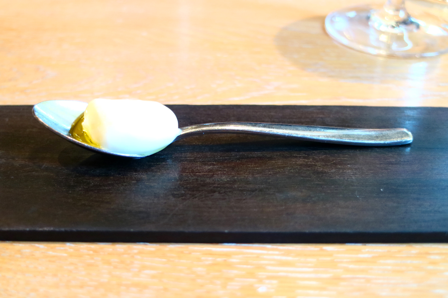 メニューは昼夜同じおまかせコースひとつ。まずは「自家製モッツァレラチーズ」を一口でパクリ。フレッシュでミルクの風味がどんとやってきます。