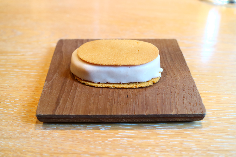そしてL'ASスペシャリテ「フォアグラのクリスピーサンド」。ハーゲンダッツのクリスピーサンドからインスピレーションを得た一品で、小判くらいの大きさのフォアグラのムースの中にイチゴのコンフィチュールが隠れていました。