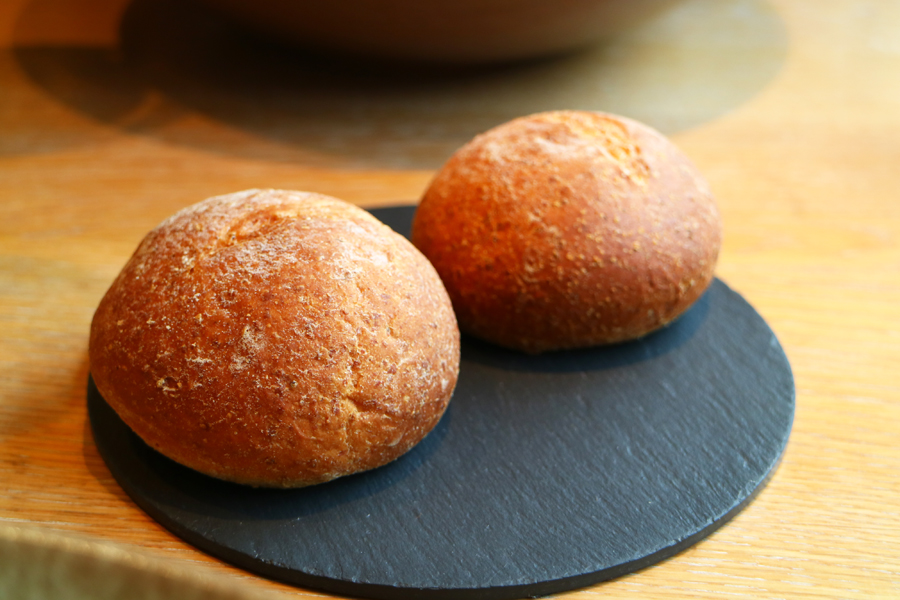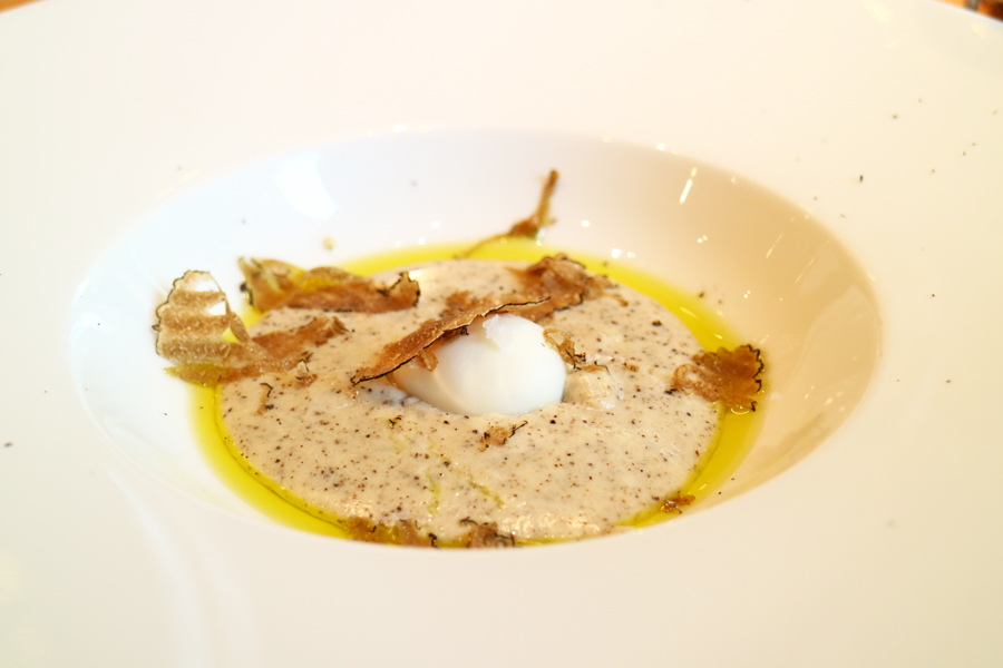 そして1つめの前菜は「ポレンタの黒トリュフ風味」。本来は「究極の牡蠣のリゾット」だったのですが、予約時に貝類が苦手だと伝えていたら、別メニューを用意してくれました。これまでに食べたことのあるポレンタ(トウモロコシ粉)を使った料理は素朴なものばかりでしたが、これは舌触りもなめらかで、何よりトリュフの風味も程よく香ってきました。