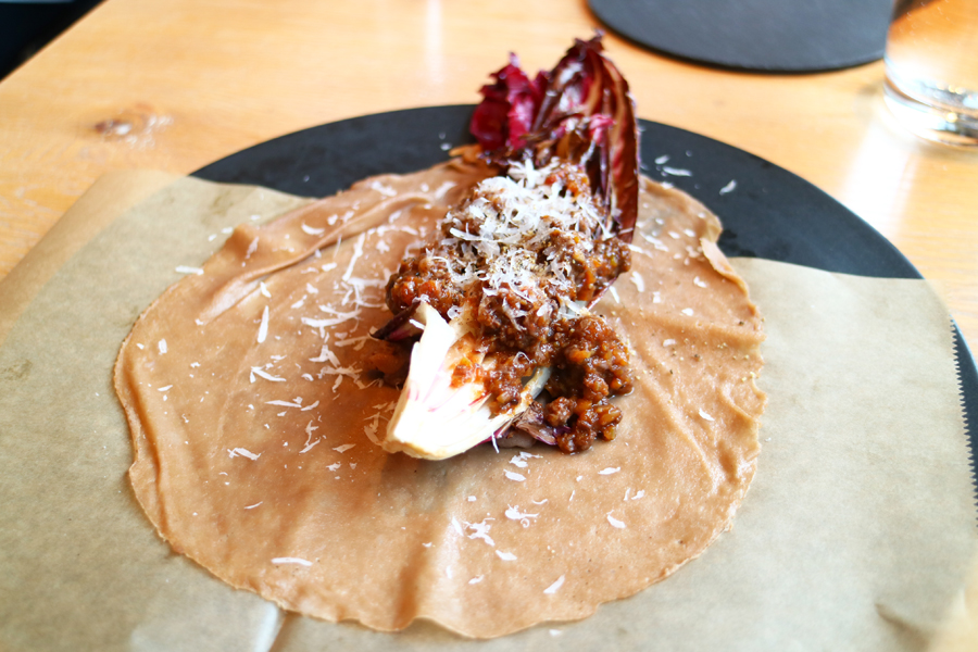 このまま手づかみでいただきます。ラディッキオは赤い部分はほろ苦く、下の白い部分に行くにつれて甘みが増してきます。野菜の苦味とラグーソースの取り合わせが絶妙。解禁になったばかりのジビエ 蝦夷鹿のラグーソースがとても美味しく、ソースだけ太麺パスタのパッパルデッレにたっぷり和えていただきたい!と願いました。。