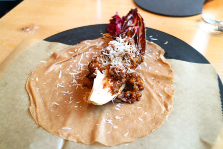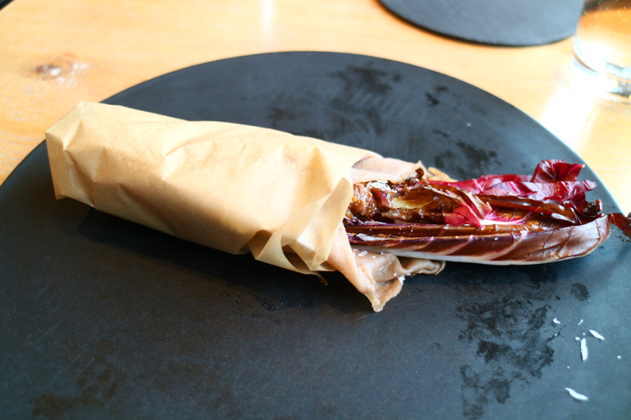 2つめの前菜は「イタリアのベッリア家から届く旬のお野菜、ラディッキオ・プレコーチェのクレープ仕立て 蝦夷鹿のラグーソース」。長い名前です。紙が敷かれていて、給仕の方に教えていただいて巻き巻き…