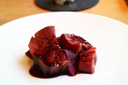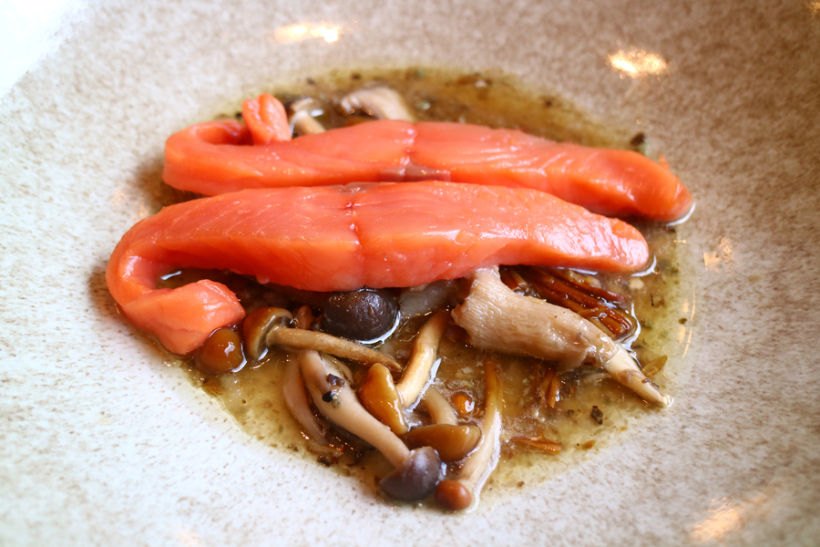 メインの魚介料理は「北海道産 秋鮭のミキュイ」。真空調理で火を通したのかしら?といった具合のミキュイ(mie cuit=半分火が通った・半生)な秋鮭は、全くパサつきのない独特の食感。合わせた4種のキノコとブラックオリーブのスープは酸味が効いていて、和のテイスト漂うお皿との相性も良く、名残惜しい秋の森のような一皿です。