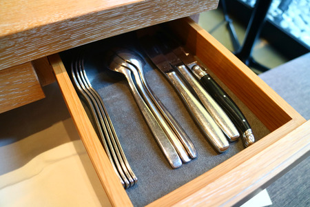 そしてテーブルの引き出しにはカトラリーがスタンバイ。テーブルにずらりと並んだカトラリーには何だか威圧感があるので、気負わず気軽な印象が増しますね。