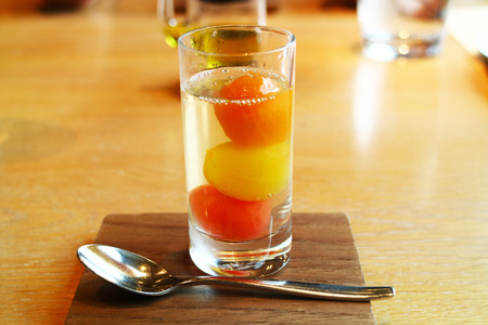 アヴァンデセールには「ミニトマトのコンポート、バジルのジュレ」。3色の可愛らしいプチトマトの周りのジュレは、透明なのにしっかりとバジル風味。口の中をさっぱりとさせてくれました。