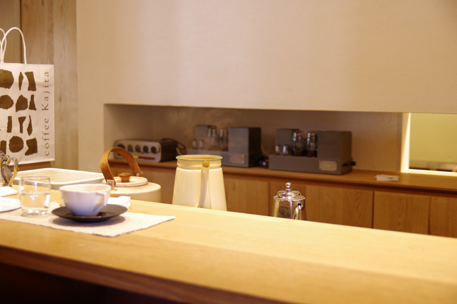 沸いているポットの奥、カウンターには真空管アンプが鎮座!