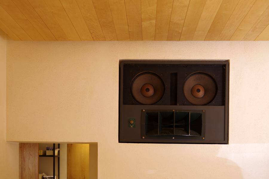 そして見上げると大きなステレオスピーカーが、左右の壁面に埋め込まれていました。私たちもB&Oのキャビネットを扱っているので、もっとオーディオについても勉強していきたいと思っているのですがね。。