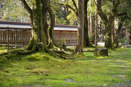 八足門、十九社とぐるりと回り、御本殿の裏側に。木漏れ日の差す苔の絨毯が、現代ではないような空気が漂っています。。
