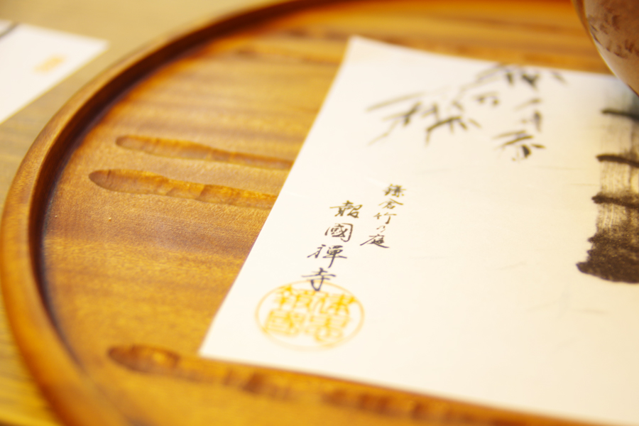 席についてしばらく待つと、お抹茶と落雁が鎌倉彫のお盆に乗ってやってきました。