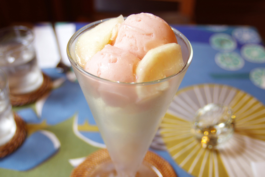 そして桃のパフェも!桃のソルベに桃のコンポートなどの入ったグラスに、シャンパンを注いでいただきます。シュワっと口の中で溶けて合わさるのが、なんとも言えず美味でした。