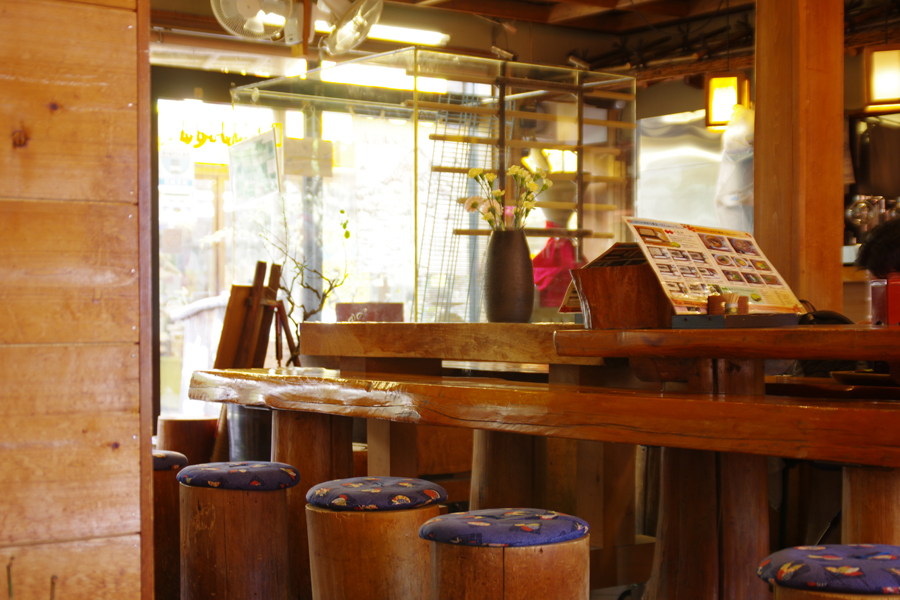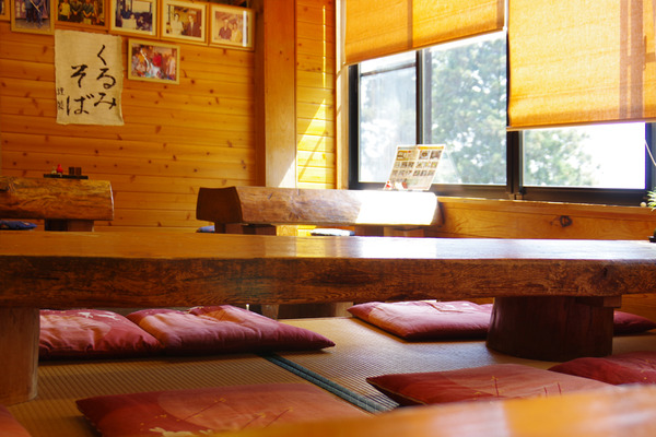 ロッジ風の店内壁に貼られた、味のある文字に惹かれて「くるみそば」を迷わずオーダー。