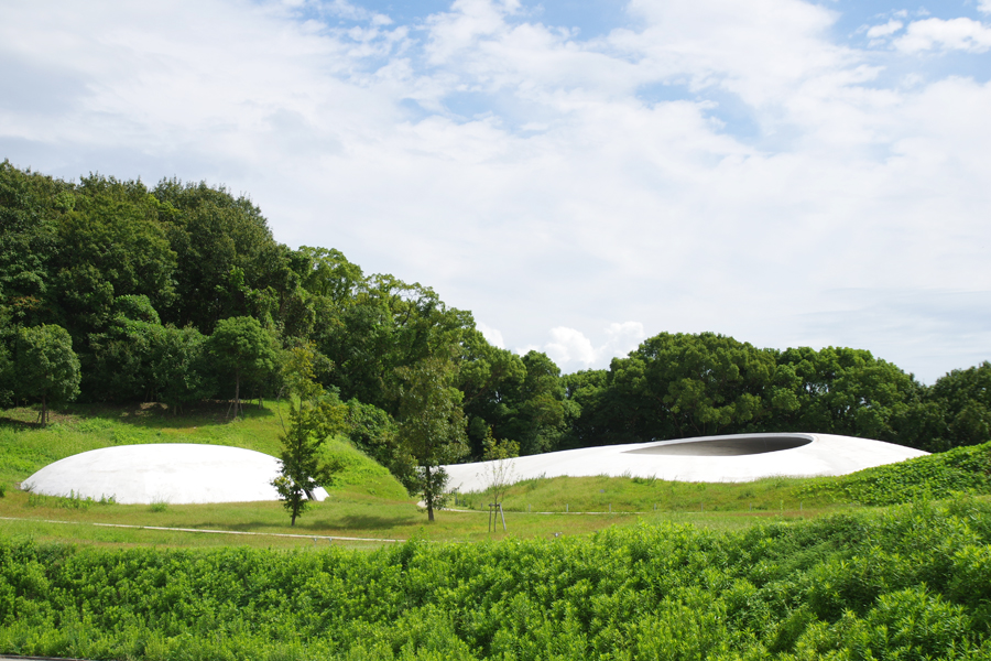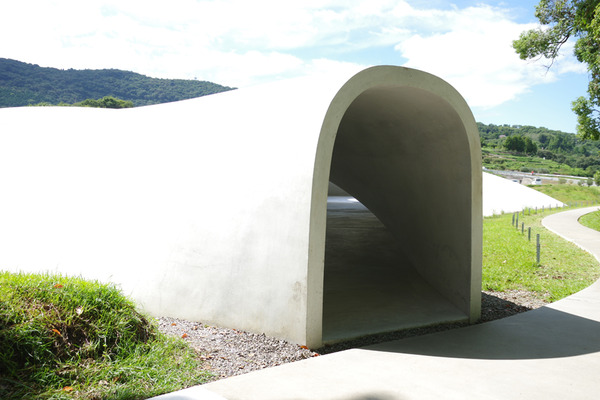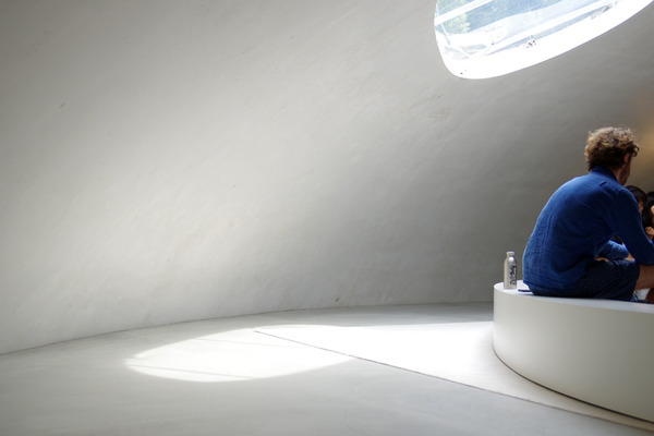 ぽっかりと空いた入り口から靴を脱いで入ると、シェル構造の内部は柱も何もないワンフロアで、天井には2箇所ぽっかりと穴が空いています(内部は撮影不可)。靴を脱いで好きなところに座り込むと、小さな水滴が床から湧き出すのが見え、それがいつしか大きな塊となりどこへとなく流れ出して泉を作り出していく。上を見上げると青い空に浮かぶ流れる雲が目に入り、そよぐ風、虫の鳴き声などを感じて、心が解放されてゆくのを感じるのです。この包まれている感じ、本当に来て良かった。。