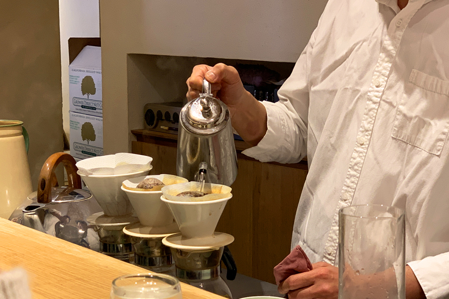 ぷくっと膨らむフィルター内の泡とともに期待も膨らみ…。家でも豆から挽いて毎朝淹れていますが、こんなリズミカルには、なかなか難しく。。