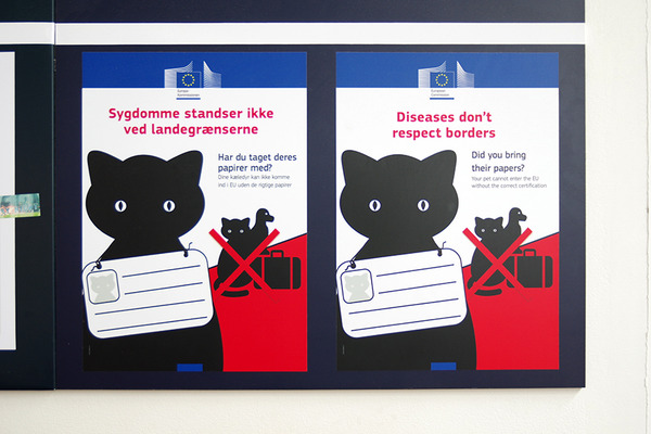 国境を越える際に必要なペットの証明書は持っていますか?というポスター。わかりやすく、可愛らしい。。