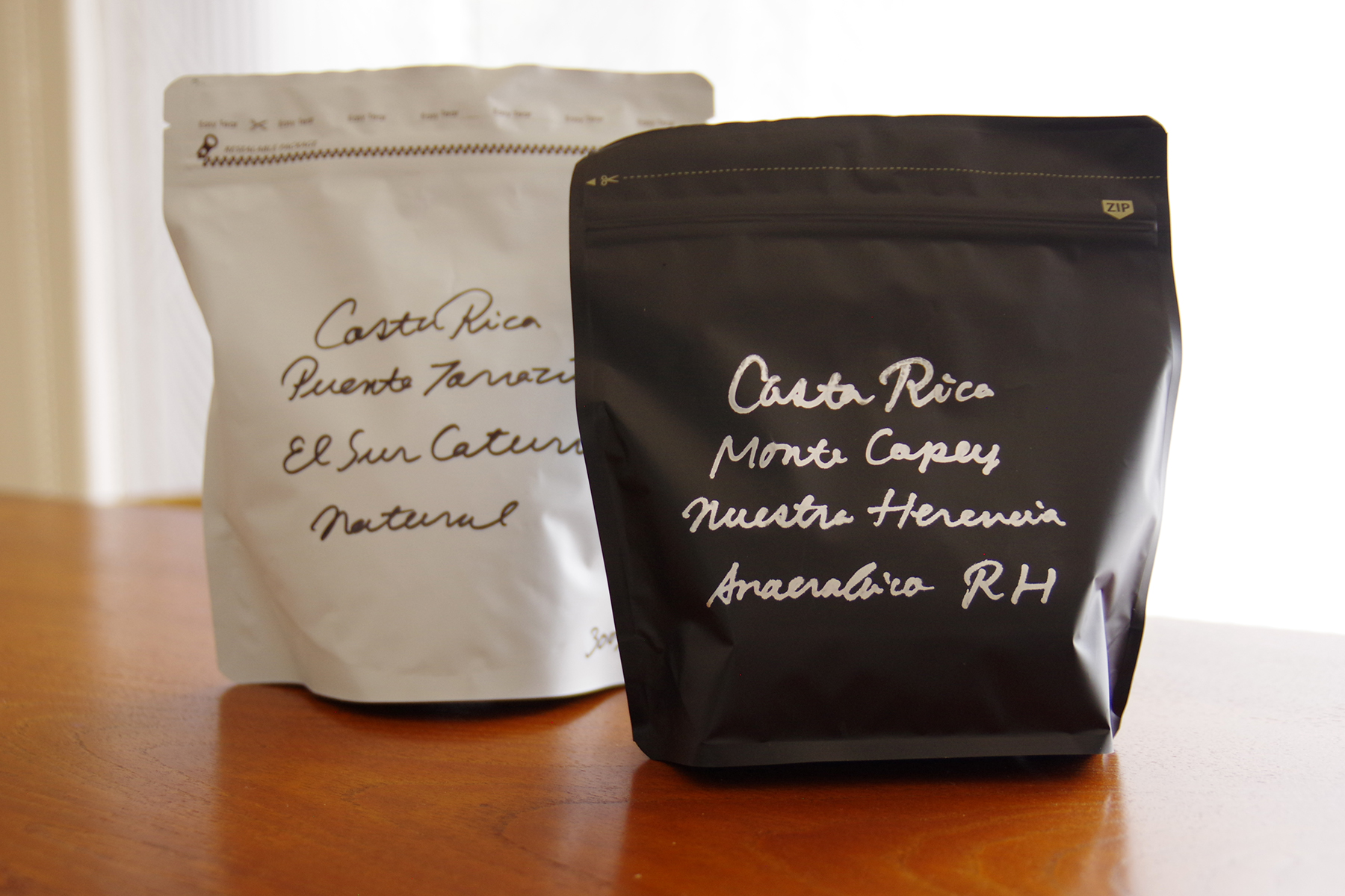 産地の異なるコスタリカのシングルオリジンを2袋。この手書きの文字に、堀内オーナーの心のあたたかさを感じます。。