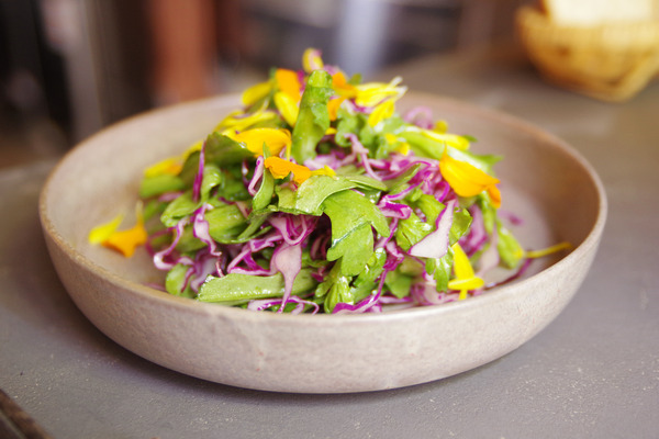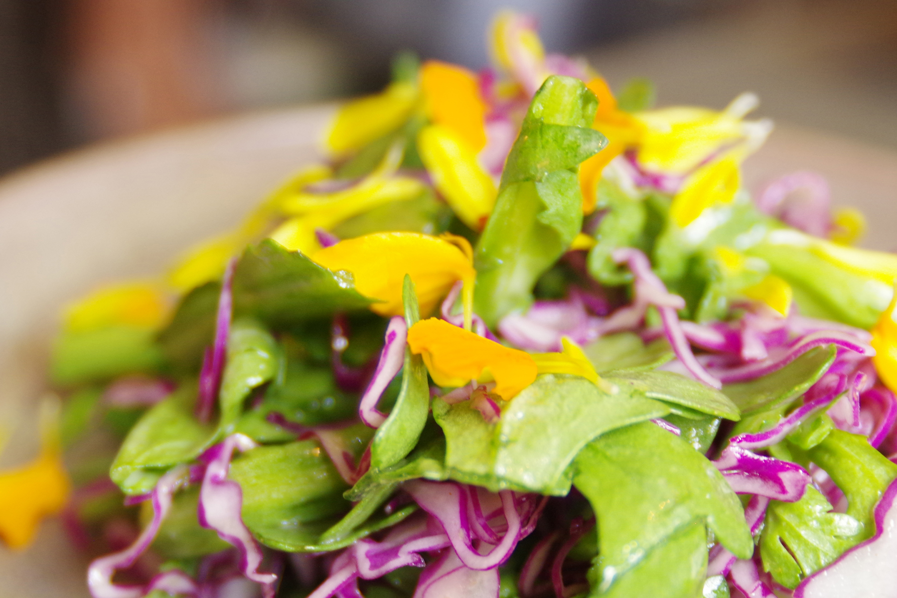 ランチはサラダとメインを選べるメニューのみ。まず「春菊と紫キャベツのサラダ」がやってきました。席からは作る工程が見えるのですが、器に盛るときの手さばきや花びらを散らすときの細やかさなど、まるで絵を描いているよう。