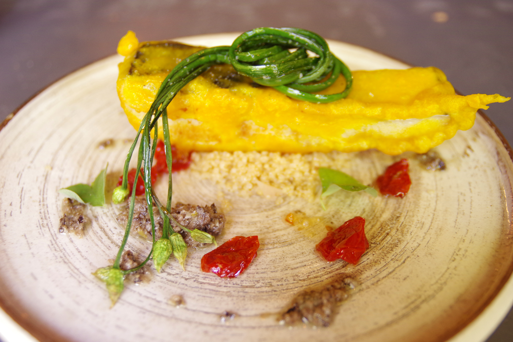 メインは肉・魚料理より1つをチョイスということで、2人で各1皿づつ頼むことに。まず魚料理の「寒鰆のフリット」。人目見て鰆の暑さに驚き!衣にはサフラン少々、ビールでのばしてカラリと上がっています。上には甘みのある花にらのブーケ、下には食感の楽しいキヌアが敷かれています。