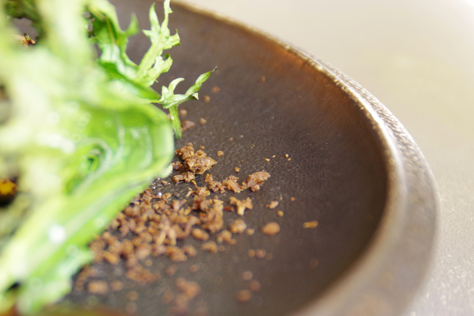 ソースはタプナードとすっきりとした味わい。シェフは「BENOIT」や「LUGDUNUM Bouchon Lyonnais」などで修行されたというので、本格フレンチがベースとなっているのですが、タプナードに山葵が入っていたり発酵トマトをセミドライにしたものを加えていたりと、オリジナリティある味わいが素敵です。