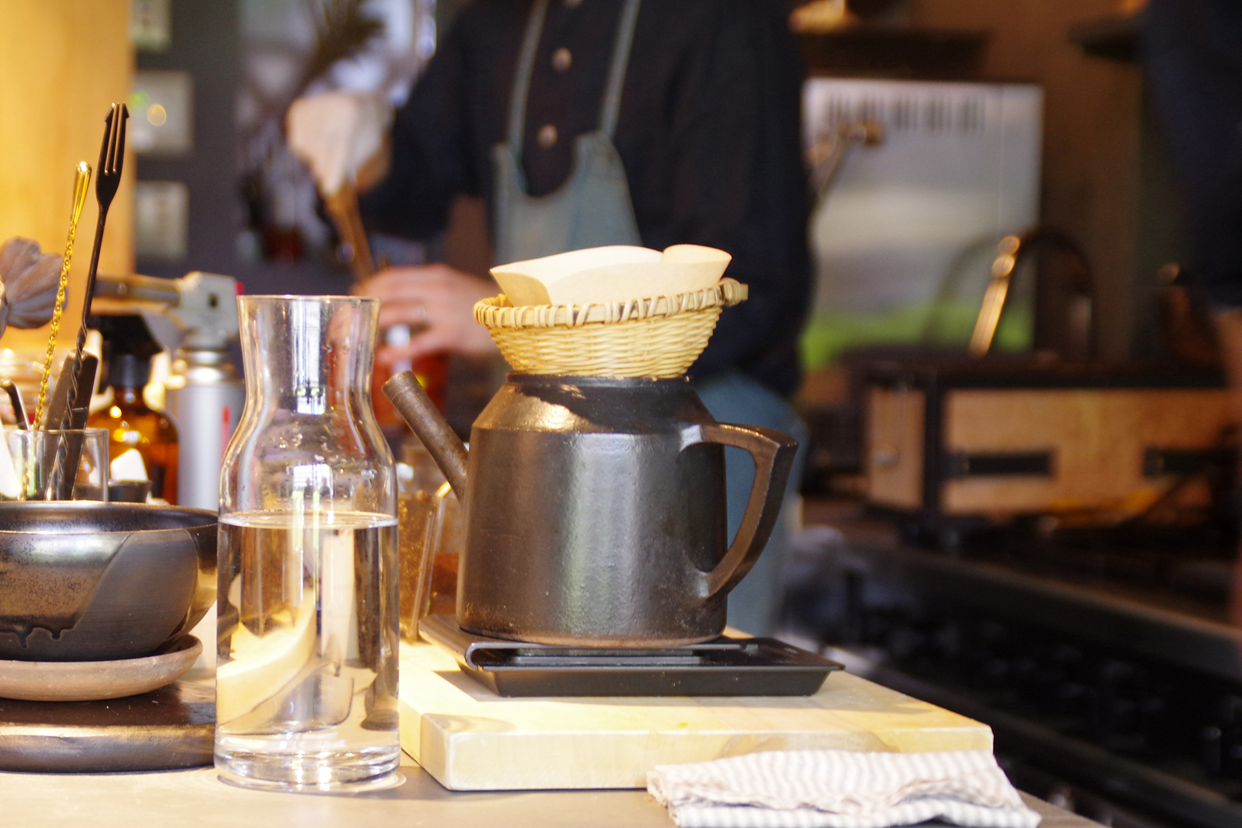 奥に座っているご夫婦は何かの記念日でしょうか、グラス傾けながらコース料理を楽しんでいました。自然派ワインの取り扱いも多いようで、私たちが食事をいただいている間にもグラスワインやオリジナリティあふれるカクテル(よもぎや甘酒を使ったものなど)が次々と作られて2階へ運ばれていきます。