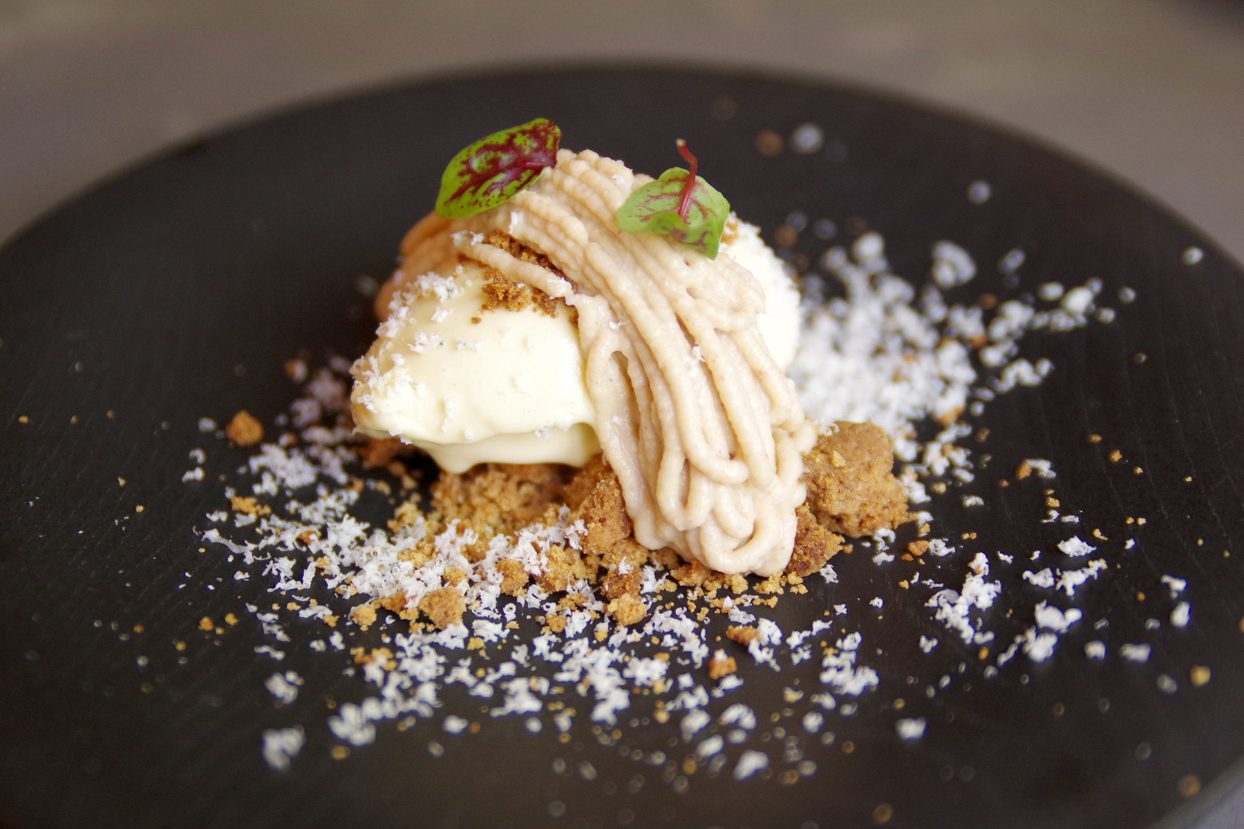 「和栗モンブラン 青カビアイス」をシェア。これがまた新しい食材のマリアージュで、渋皮ごとペーストにして生クリームと合わせたやわらかな栗ペーストの下には、ゴルゴンゾーラのアイスクリームと黒糖クランブルが。塩気とコクが栗の味わいに寄り添った一品。ゴルゴンゾーラは上から削ったものもふりかけられているので、香りが生きています。