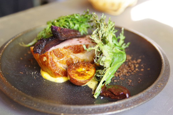 もう一皿の肉料理は「越後豚のロティ」、途中でお皿ごと交換していただきます。付け合わせは紫にんじんとジャガイモをギュッと味わいを凝縮させて、それにフリルレタス(でしょうか?)は乾燥してあるのかフワパリッと新食感。まるでノルディック・キュイジーヌのような一皿です。