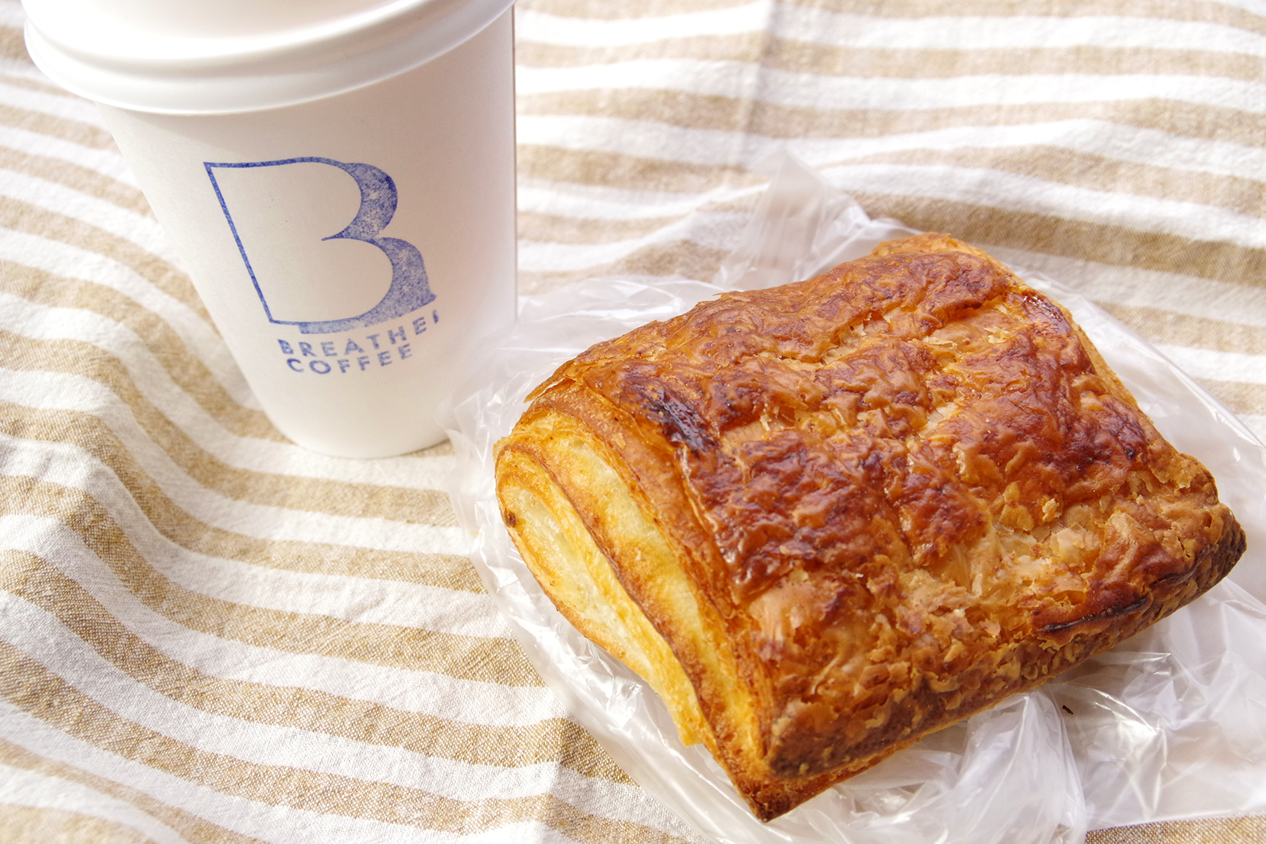 BREATHER COFFEEのフラットホワイトと、先ほど購入した充麦のパン・オ・ショコラを食後に。こちらも車内にて。。束の間ではありましたが、気持ちの良い風を浴びながら海を見るドライブは気分転換にもってこいだなぁと改めて実感しました。