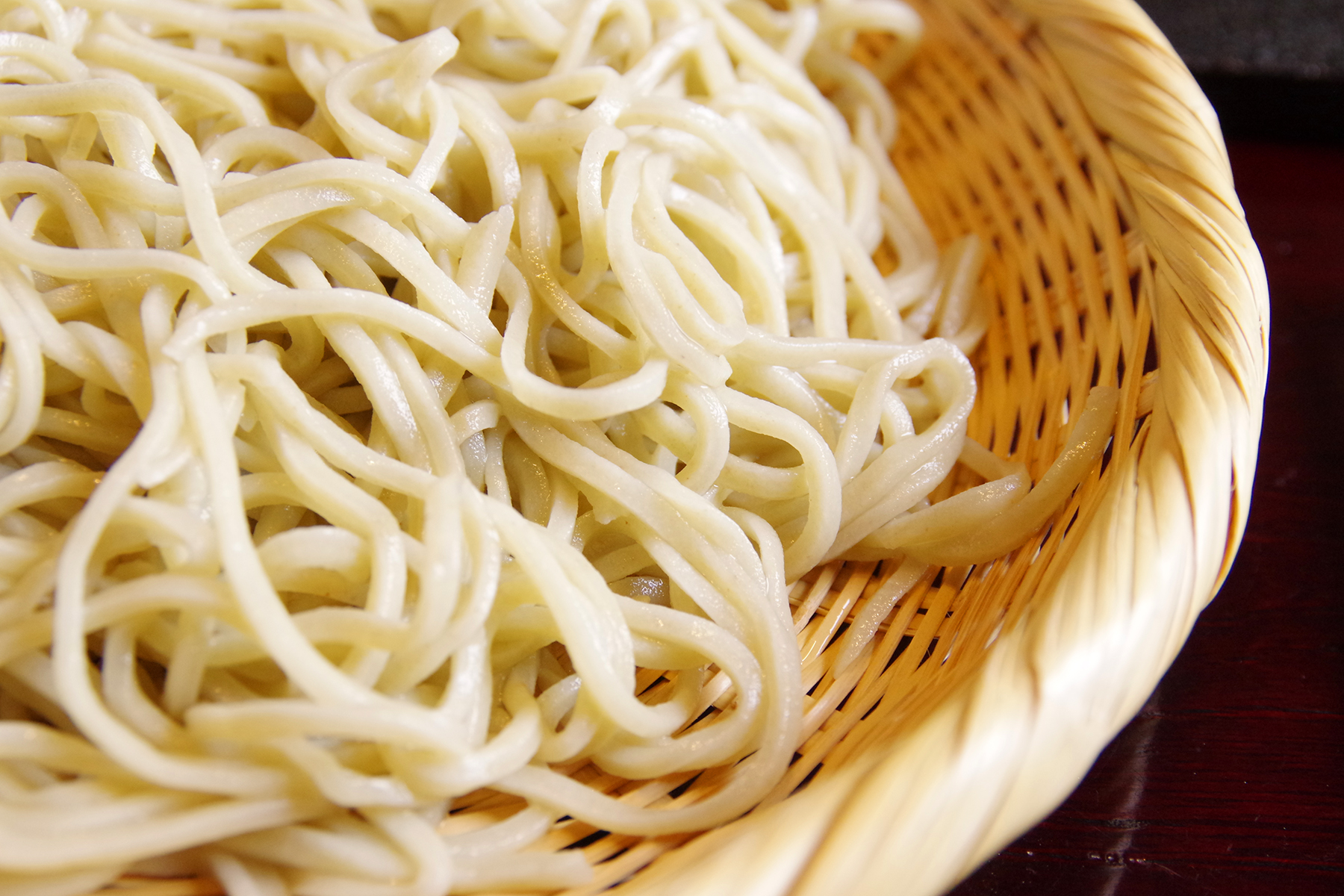 そして主役のざるそば登場。石臼で自家製粉された蕎麦が八ヶ岳在来種、ほんのりウグイス色で端正な顔!