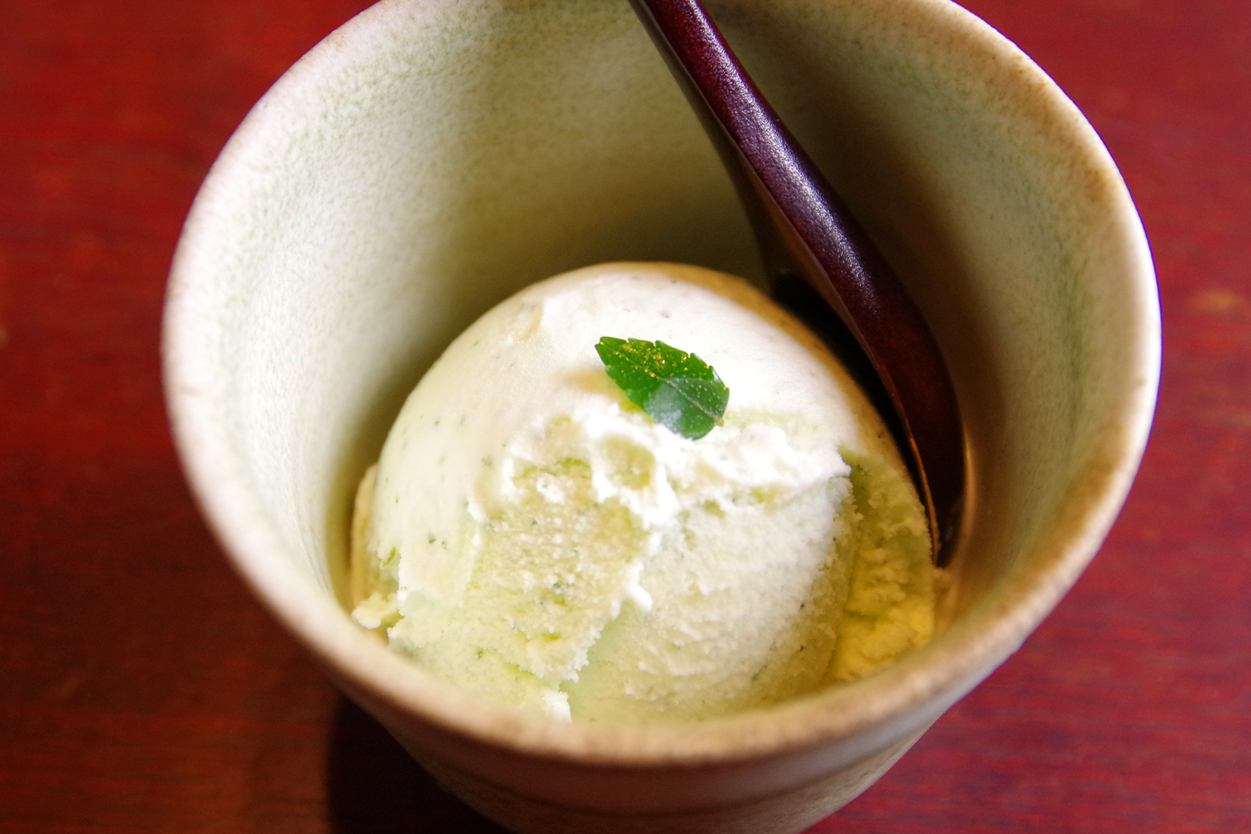 デザートのアイスは…蕎麦でも抹茶でもミントでもなく、葉山椒!?これがまたスッキリな味わいで、食後のデザートにはもってこいです。調べてみると同じ八ヶ岳のYETI GELATOのものだそう、実店舗を持たないジェラート屋さんなので次はどこで出会うことができるかしら。