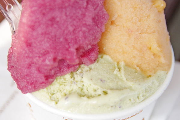 店内にも席はありますが、この日は店先のベンチでいただきます!左上から「巨峰ランブルスコ」「ネクタリン」「ピスタッキオ トスタート」。