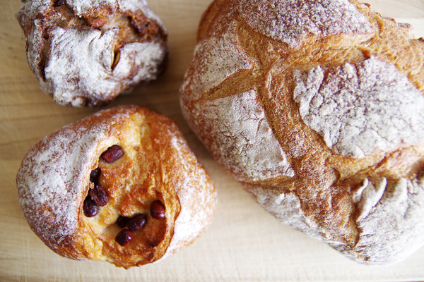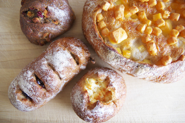 右上から「チーズフランス」「片浦クリチー」「チョコクルミ」「モカクランベリー」。「片浦クリチー」は小田原の名産である片浦レモンのピールを混ぜたクリームチーズを使ったフィリングを、やわらかめの全粒粉のリーンな生地で包んでいるもの。そして一番は印象に残った「モカクランベリー」は、珈琲の香りたっぷりのホロ苦生地にホワイトチョコレートとクランベリーを合わせているもの。