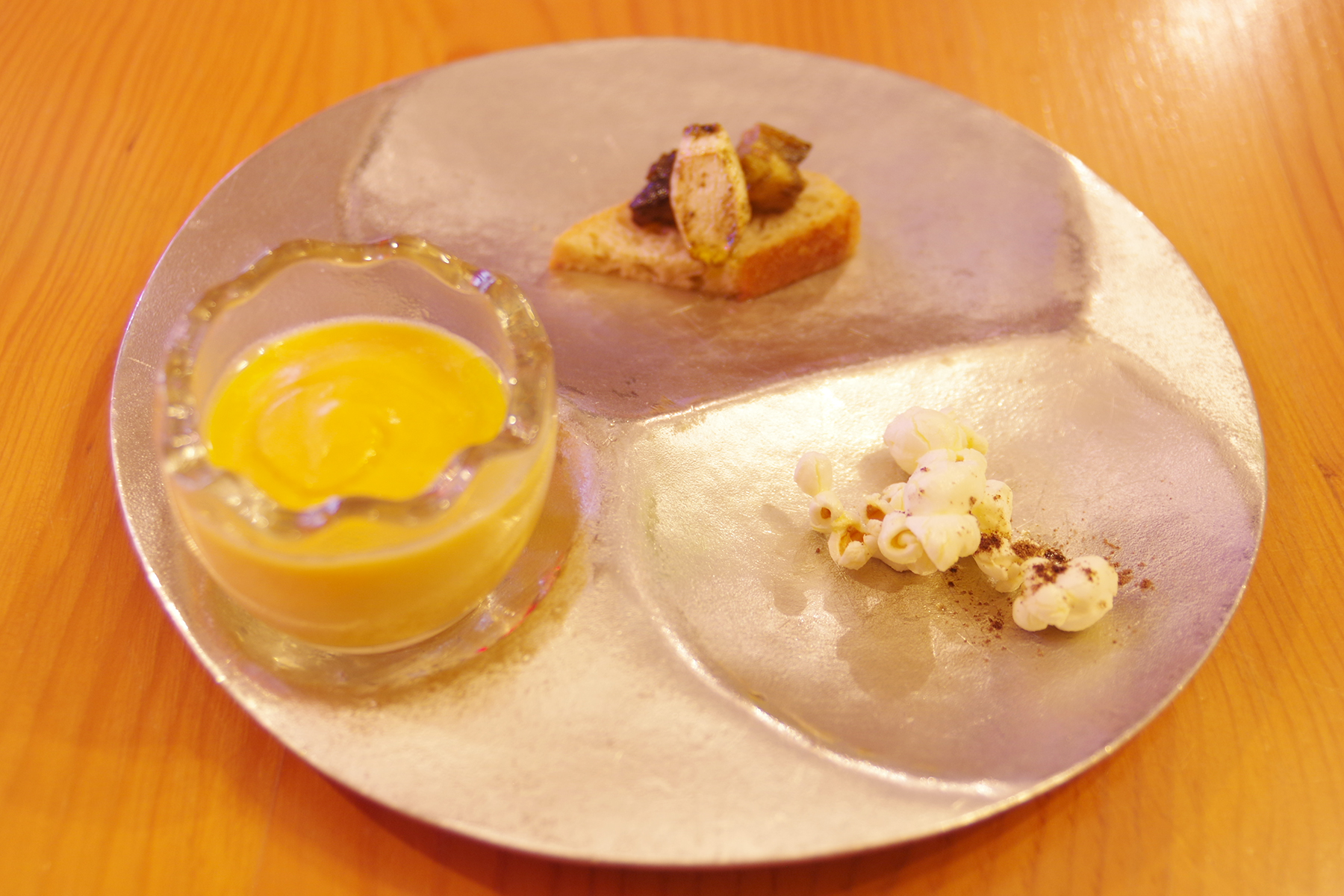 さてさてアミューズは3種。「カボチャのポタージュ」と「さざえとマコモダケのブルスケッタ」そして…