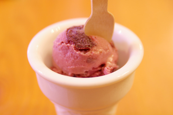 デザートの前の一口ジェラートは「秦野産ぶどうとヨーグルト」。葡萄の品種は藤稔?まるでプルーンのように凝縮した味わいで、かつヨーグルトベースのために何しろ爽やか。中に入った未知の葡萄について伺うと、フレッシュで仕入れたものをオーブンでセミドライにしているそう。そんなにまで手間がかかっているのに、こうしてさらっと提供してくれることに感謝してありがたくいただきました。