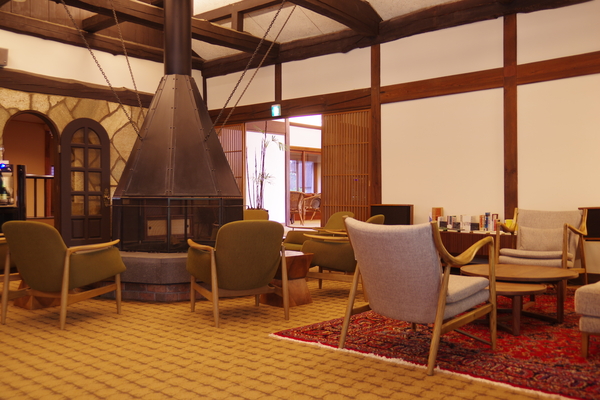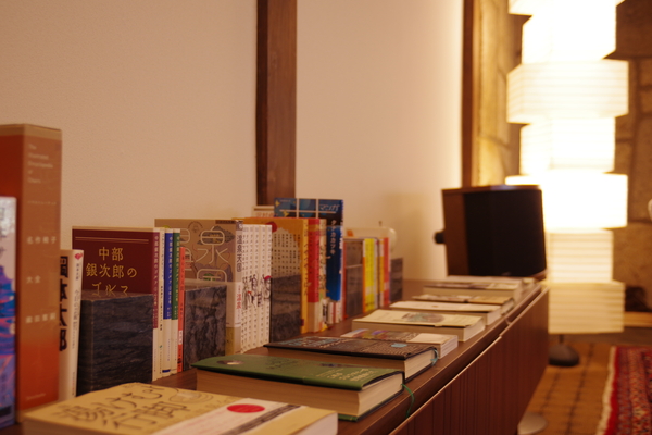 一角にはセルフでいただけるドリンクコーナー、そして温泉や食にまつわるエッセイ、宿にゆかりのある文豪の小説など凝縮された選書の本コーナー(とその先にも特大版のAKARI!)。