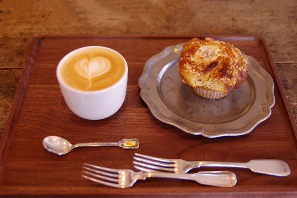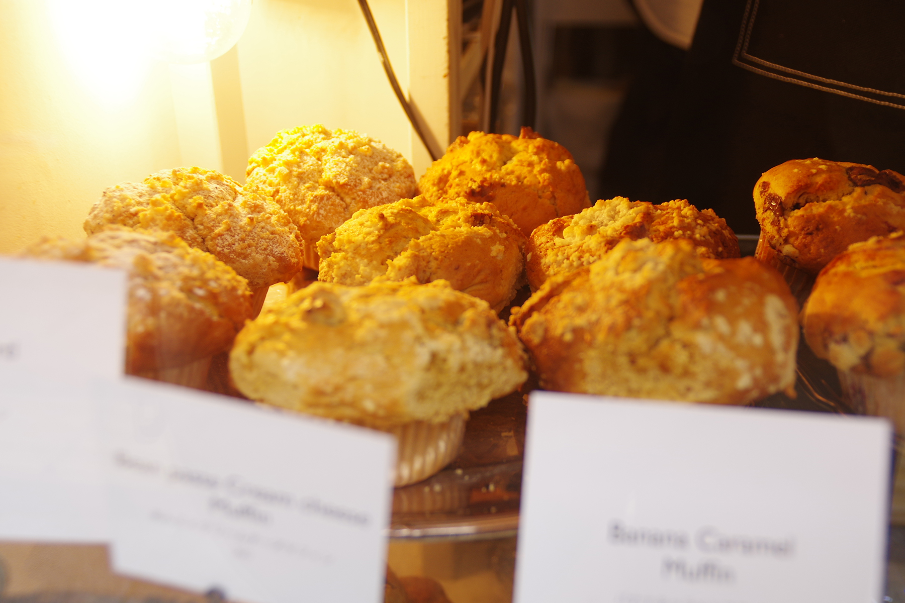 カウンター下にある小さなショーケースには、出来立てのマフィンがたっぷり。2階にあるカフェスペースでいただきます!