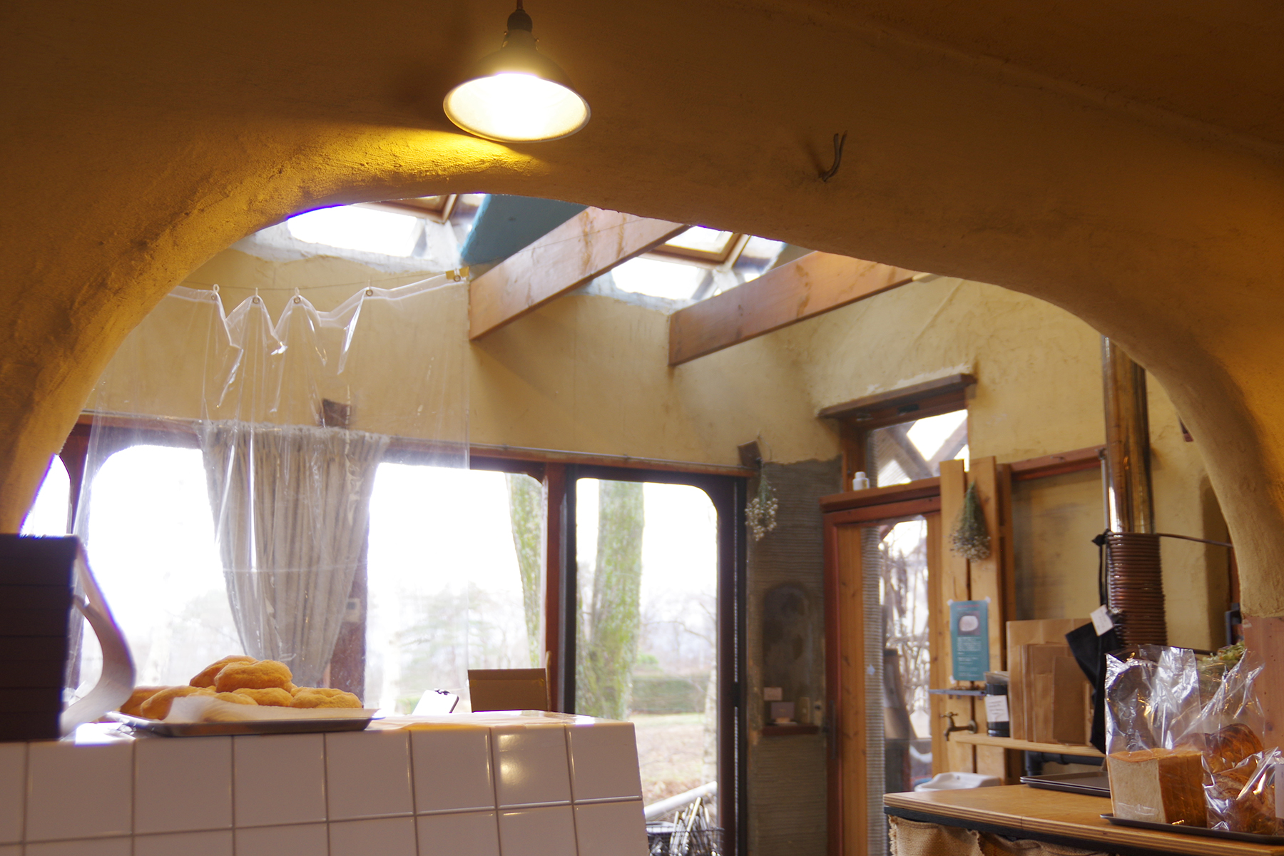 megane のレストラン側から見た入り口側のパンを販売しているところ。ガラス窓や天窓から光が降り注ぎ、何よりこのあたたかみのある土壁が素敵ですね。