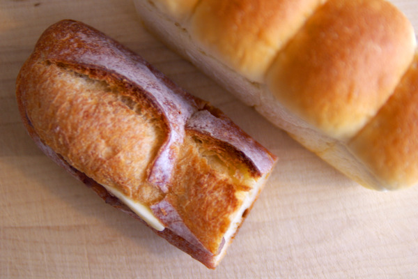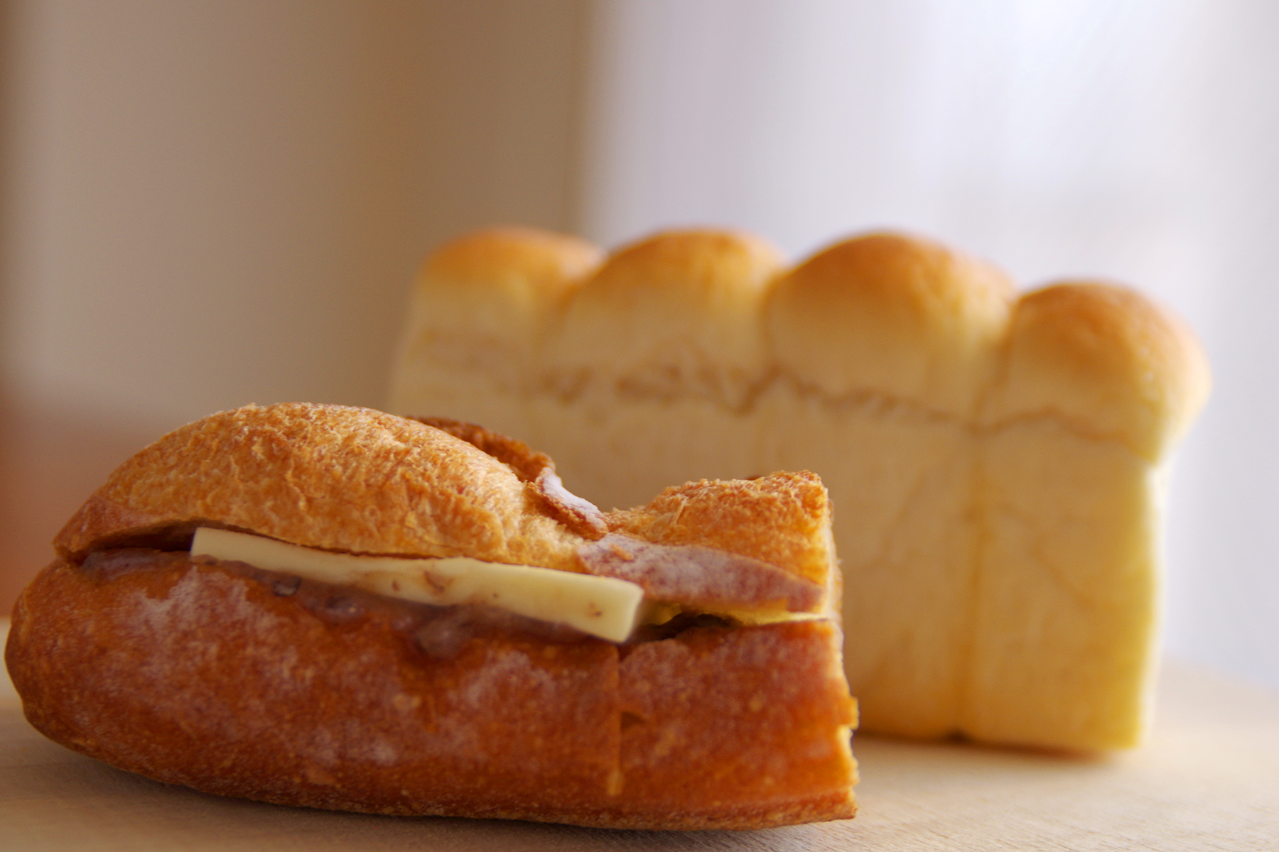 そして奥の小ぶりな食パンは「ミルクブレッド」。水分を牛乳のみで焼き上げているそうで、側面に耳がなく内相と一体となったふんわり食感。