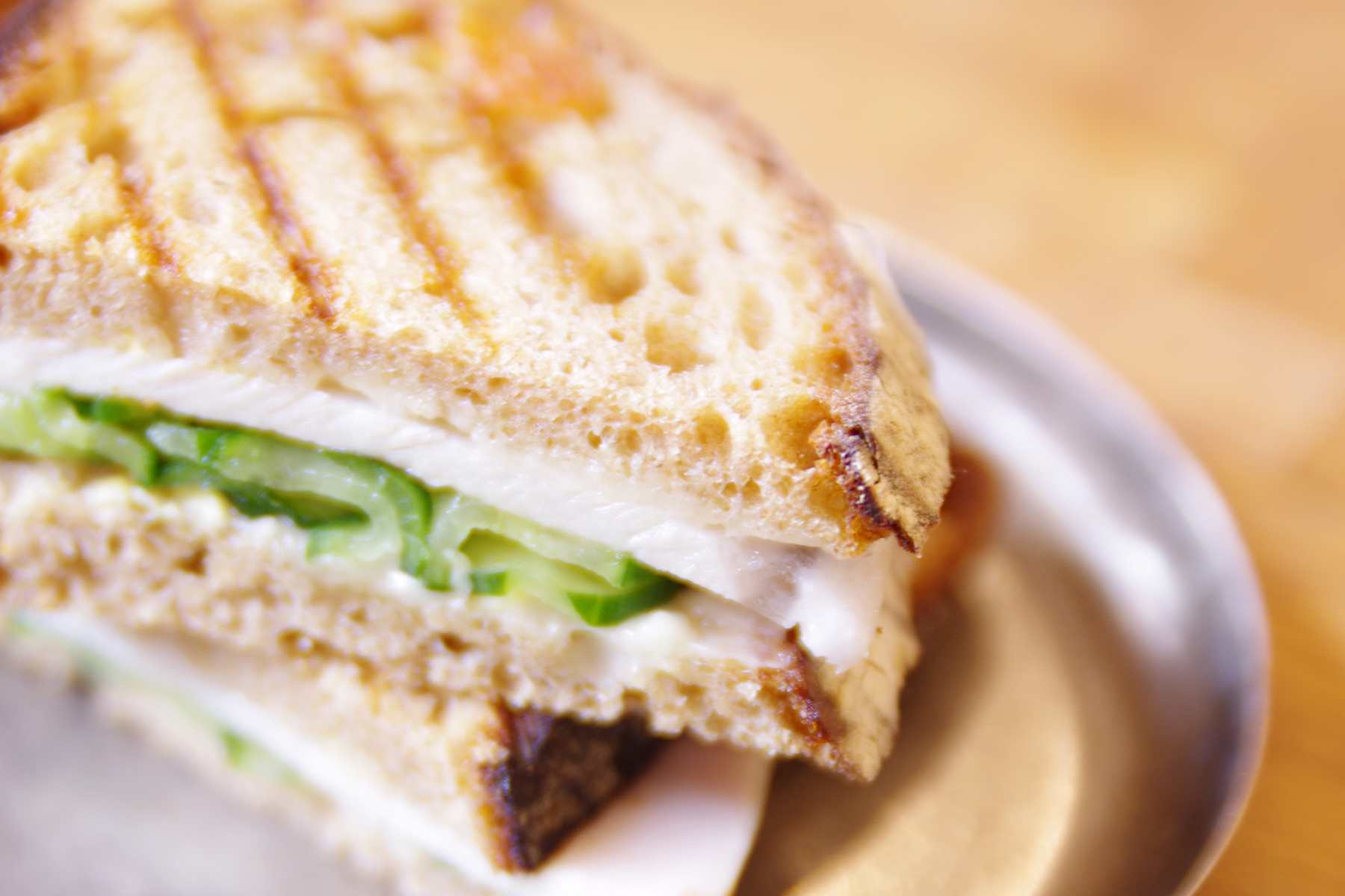 セットのサンドウィッチは「ハムと胡瓜」をチョイス。厚切りのロースハム、そしてシナッとさせてしっかり水気を切ったきゅうりを、ごく薄切りのカンパーニュにサンド。薄いのに味わい深いカンパーニュは…チクテベーカリーのパンかしら。