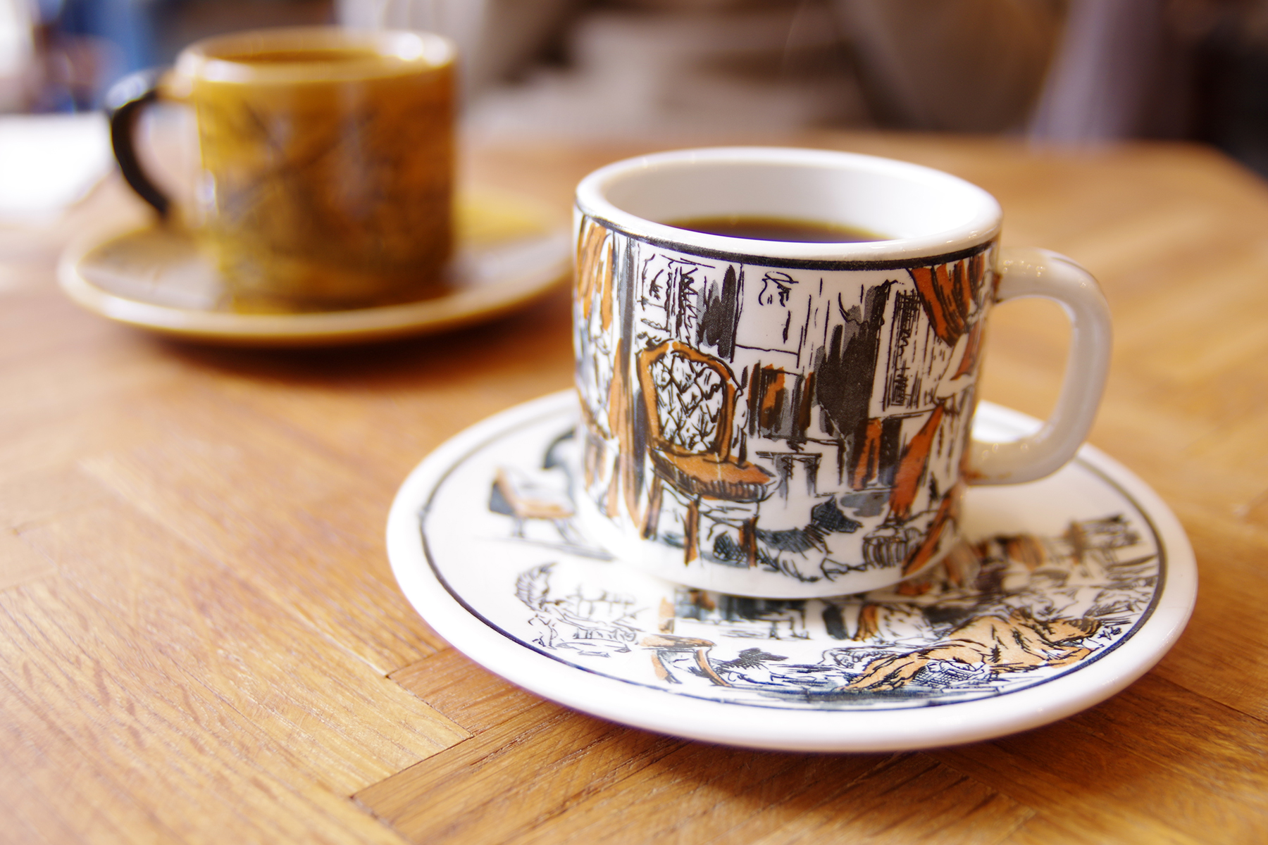 セットのコーヒーは福岡の珈琲花咲のブレンド。北欧のものとはまた違う雰囲気のカップが面白いと思ったら、輸入用に作られていた国産のカップなのだそう。ガラス製コップなどの国産ヴィンテージは知っていましたが、こんな素敵なカップもあったのですね。